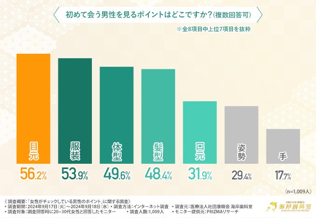 初対面の男性の目元や服装、体型や髪型に注目している女性が多く、他にも口元と回答した女性も3割以上いました。