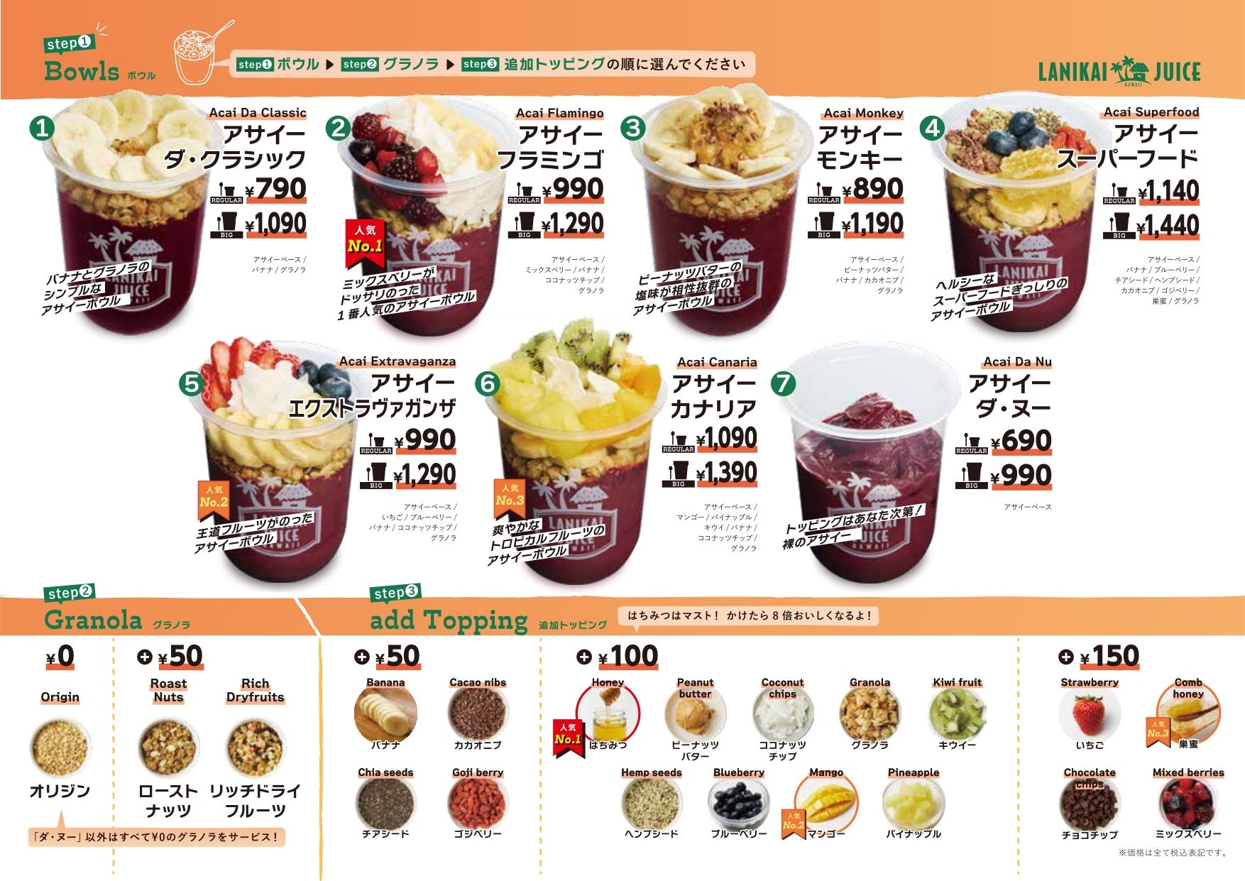そして驚きなのがその価格。これまで日本のアサイーボウルやスムージーはどうしても高価格になりがちでしたが、ラニカイジュースでは「より多くの人にアサイーボウル&スムージーの味を広めたい」という想いから価格を抑えることに努め、ハワイ本店と同じレシピで作ったアサイーボウル&スムージーをお求めやすい価格で提供します。