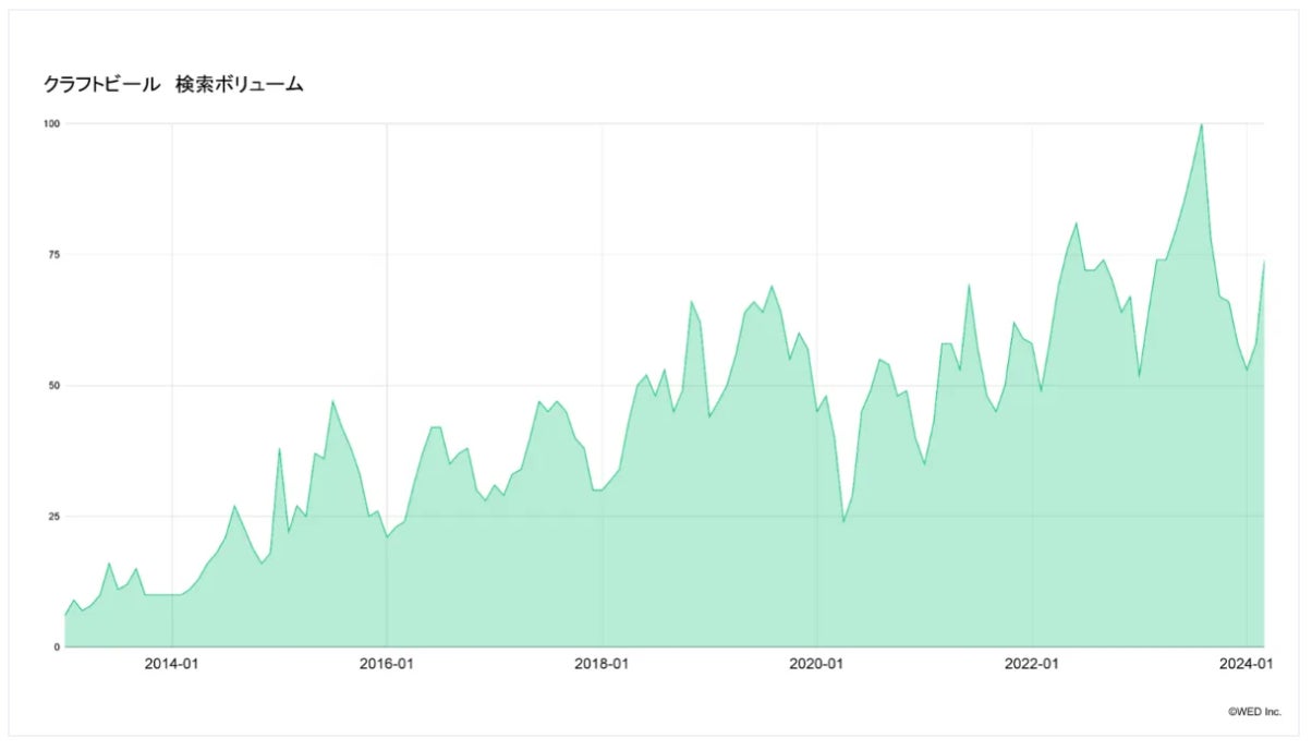 2024年現在、Googleトレンドで「クラフトビール」の検索指数は10年前と比較して10倍程度に成長しています。