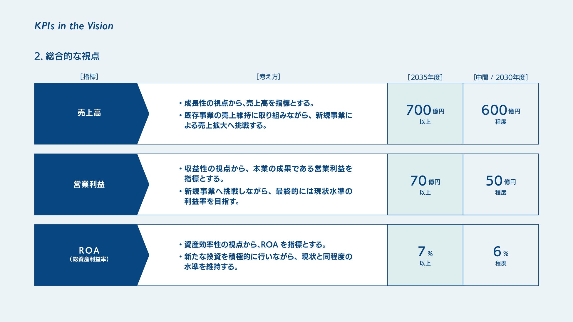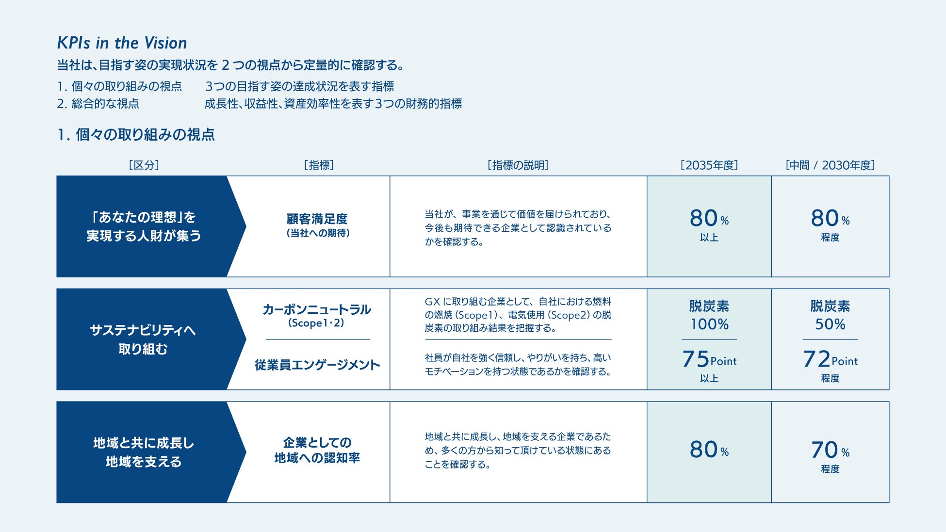 2035年度までに当社が目指す姿は、3つのコアビジョンとその実現に向けたアクション、達成度合いを評価する指標で表しています。この取り組みを通じて、当社に関わるすべての方たちから選ばれ続ける企業を目指します。