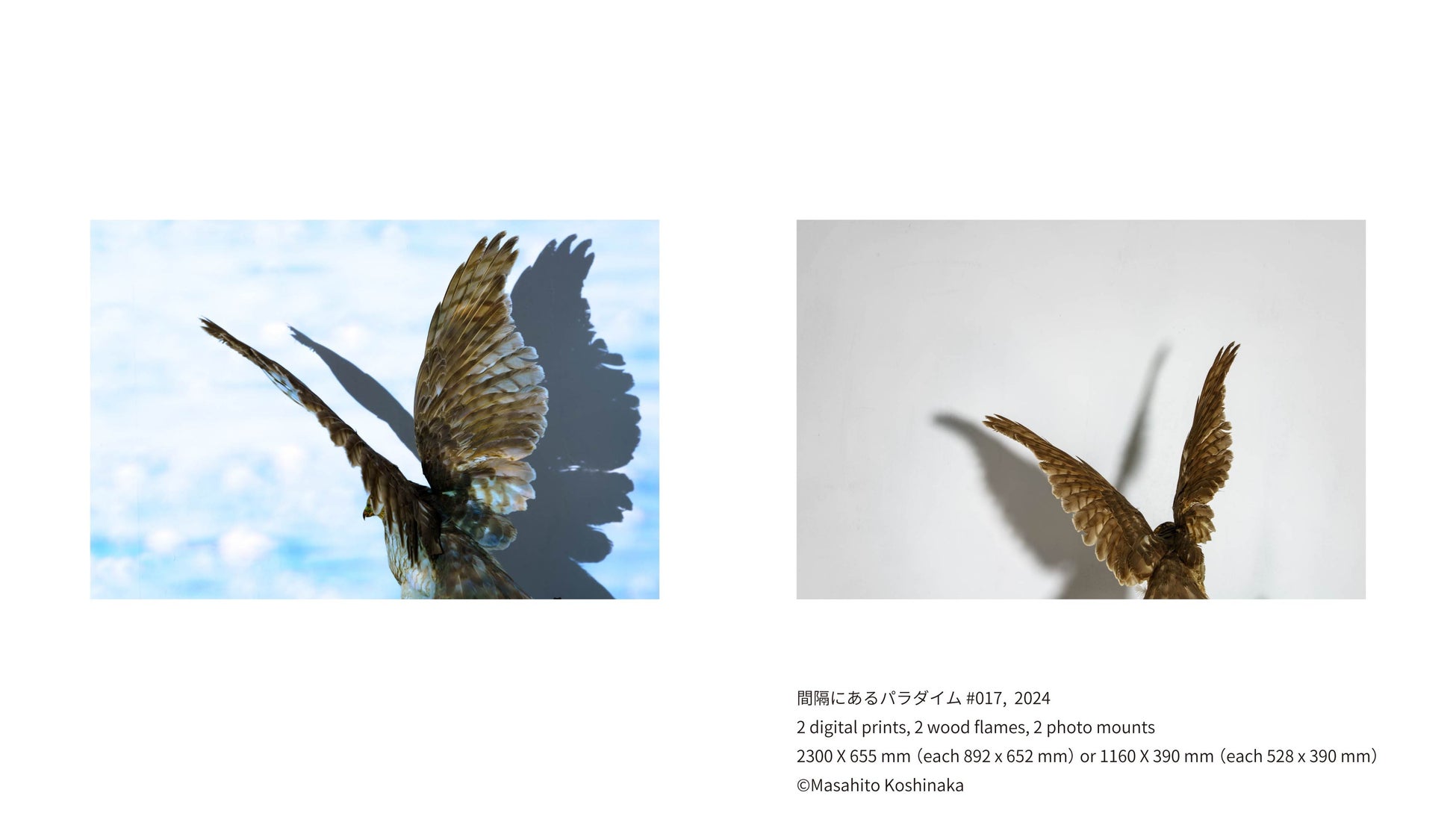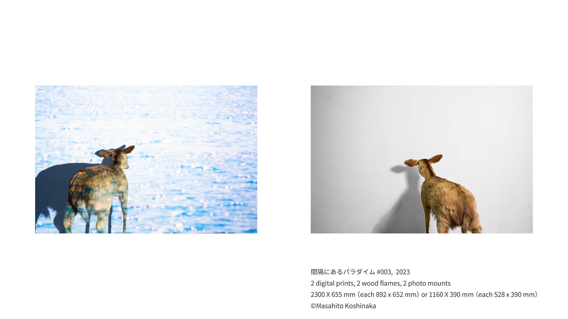 「剥製 パラダイム」作品のシリーズは、亡き存在としての剥製の「実像」と、海に向かって佇むという意思を感じさせることで「見立ての生命」を与えた「虚像」とを平行に見せることで、剥製が担っていたひとつのパラダイムが終焉したその先の、言語化できないエクリチュールを体感する「劇場」として作用します。