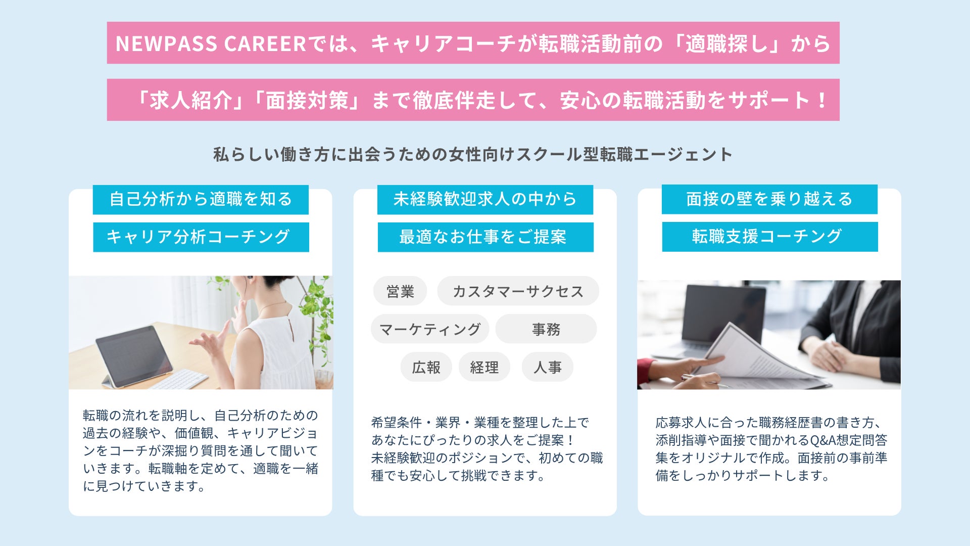 NEWPASS CAREERは、キャリア設計から面接対策までオンラインで学び、“自分らしい働き方”を見つける女性のためのキャリアスクールです。