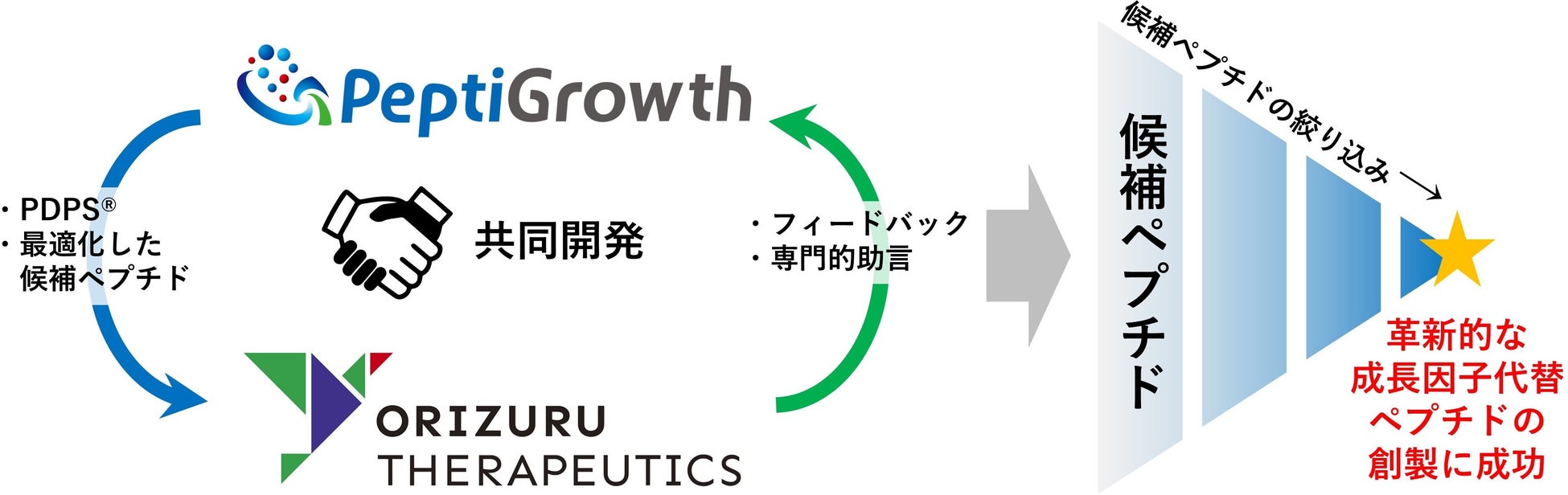 オリヅルセラピューティクス株式会社(本店:京都府京都市、事業所:神奈川県藤沢市、代表取締役:野中健史、以下「オリヅルセラピューティクス」)とペプチグロース株式会社(本社:東京都千代田区、代表取締役:杉本二朗、以下「ペプチグロース」)は、2023年8月22日に発表した、オリヅルセラピューティクスが開発する再生医療等製品の製造時に使用されるリコンビナント成長因子を代替する化学合成ペプチドの共同開発を、このたび完了したことを報告いたします。当該ペプチドはリコンビナント成長因子と同様に細胞受容体に結合し、細胞内でのリン酸化およびシグナルを誘発し、多能性幹細胞から分化誘導および増殖を引き起こすことを確認しました。