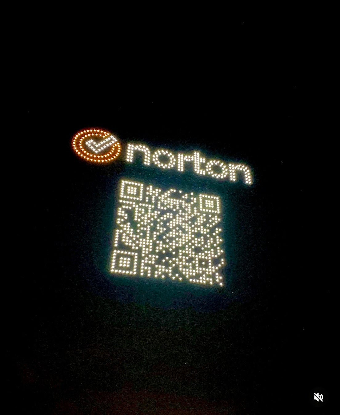 第2ステージはノートンライフロック社(*2)スポンサードのストーリーショー。パソコン画面が現れ、「シモノセキ」と検索すると関門橋やクジラなど下関ゆかりのアニメーションが掲げられ、そして音楽をダウンロードしたところウイルスに感染、ノートンのウイルス除去システムによりウイルスは駆除され問題は解決する、というストーリー。最後にはQRコードが掲げられ無料のソフトがインストールできる画面に繋がるサービスも。観覧会場の観客、そして花火大会を楽しむために寄港をしていたクルーズ船の乗客も一斉に携帯電話をQRコードに向けていました。また当日花火大会をTライブ中継をした画面を通じてもQRコードが読み取れたと話題になりました。