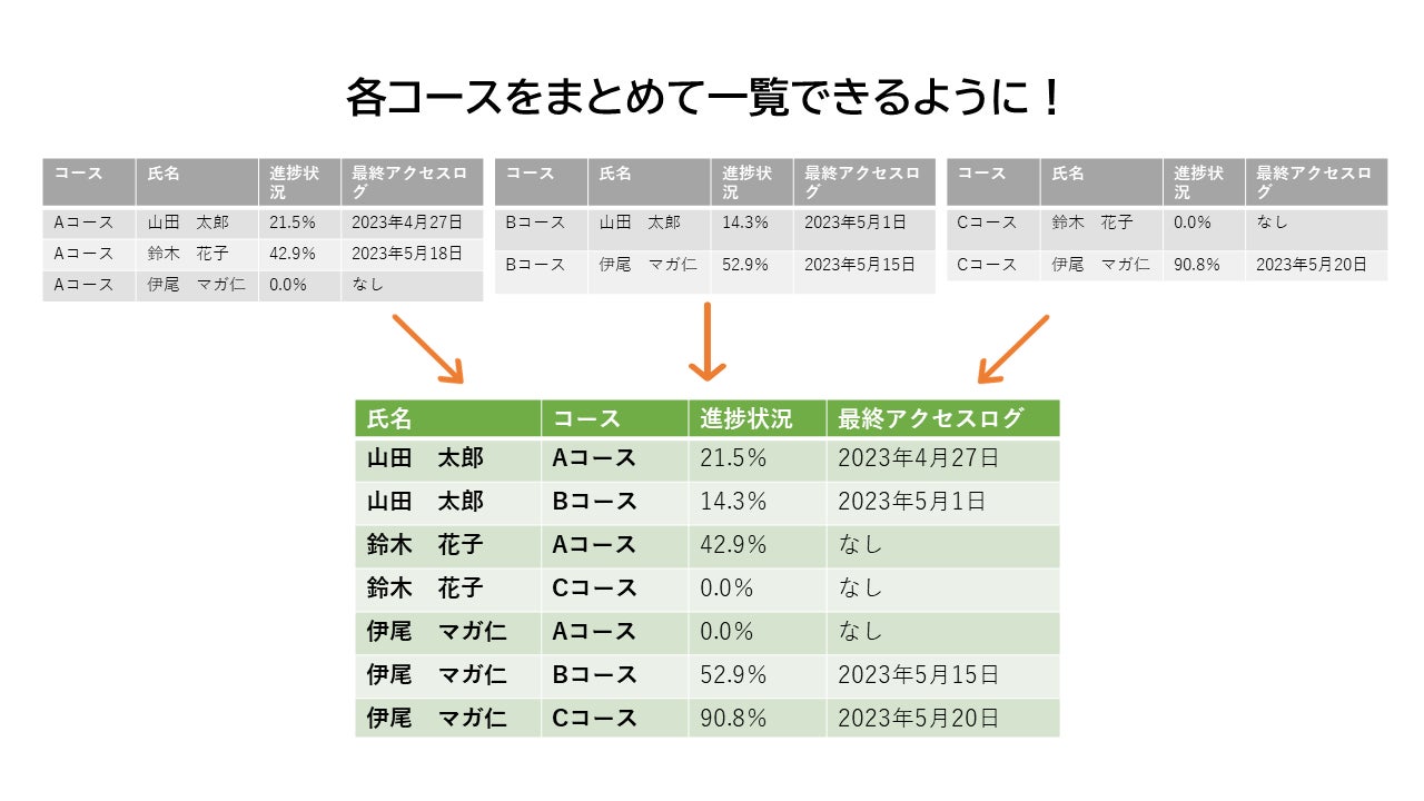 これまでの「Moodle(ムードル)」標準仕様では、受講者の学習進捗状況は各コース毎に確認する仕様となっており、「Moodle(ムードル)」に登録された全コースの登録者について一目で学習進捗状況を把握することがやや手間がかかる課題がありました。しかし、「IO Moodle(イオムードル)」では、あらかじめ設定を行うことで、全コースの受講者と進捗状況が一目で確認できるようになります。
