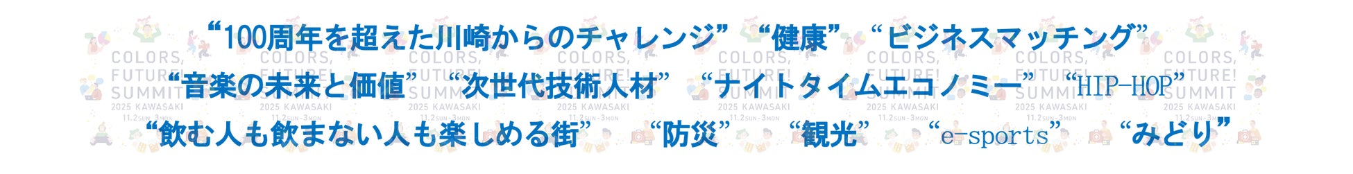 「Colors,Future!Summit2025」は、「川崎最大の秋の祭典」の実現を目指し、川崎駅周辺でこの11月に同時開催する5つのイベントの一つとして実施します。イベント間の連携促進・ブランディング促進のため5つのイベントに共通テーマを設けています。