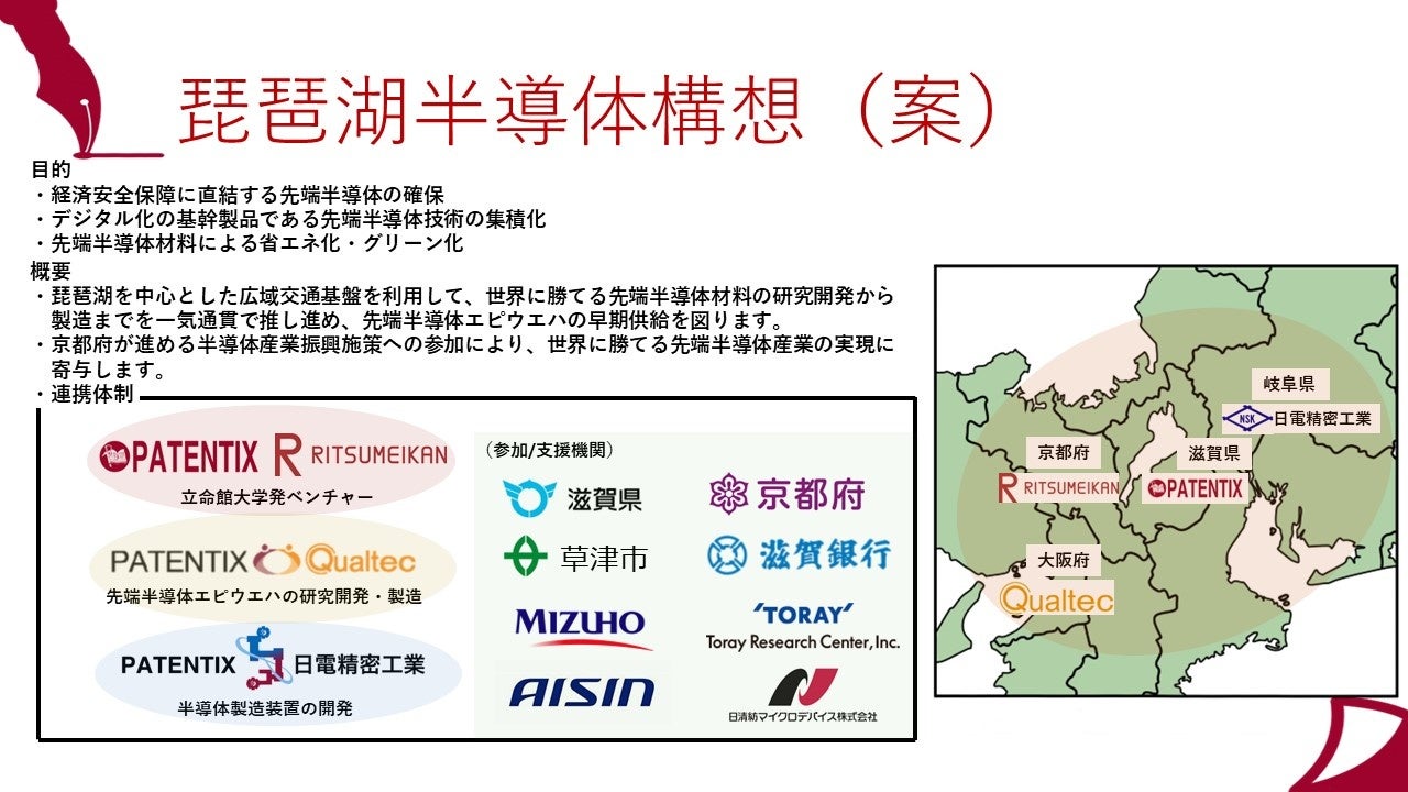 水資源が豊富な琵琶湖を中心とした広域交通基盤と半導体産業にかかわる恵まれた地理的 条件を利用して、最先端半導体材料の研究開発から知財・経営戦略に立った社会実装までを も網羅する国際的な半導体産業拠点を作る展開を進めています。2023年12月14日のプレスリリースでは、株式会社クオルテック及び日電精密工業株式会社と、PATENTIXとがそれぞれ資本業務提携を行いました。引き続き、最先端半導体材料の研究開発から製造まで、 一気通貫で推し進め、先端半導体エピウエハの早期供給を可能とする企業群を形成し、琵琶 湖半導体構想の推進とともに、京都府が進める半導体産業振興施策への参加により、世界に 勝てる先端半導体産業の実現に寄与してまいります。