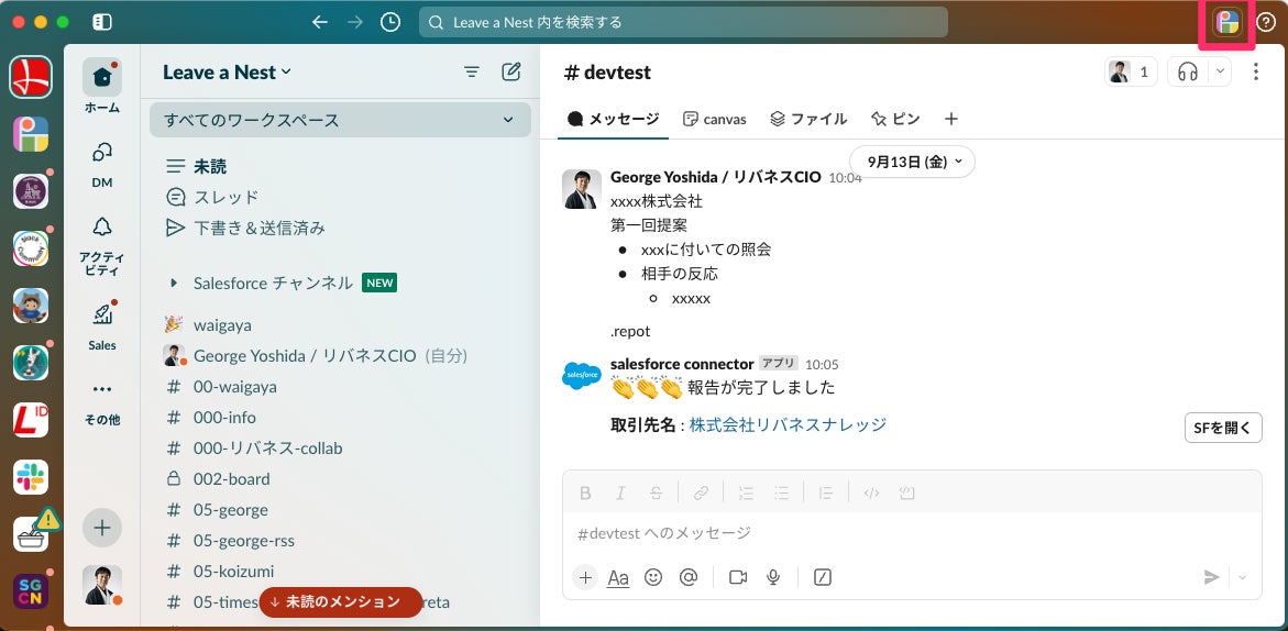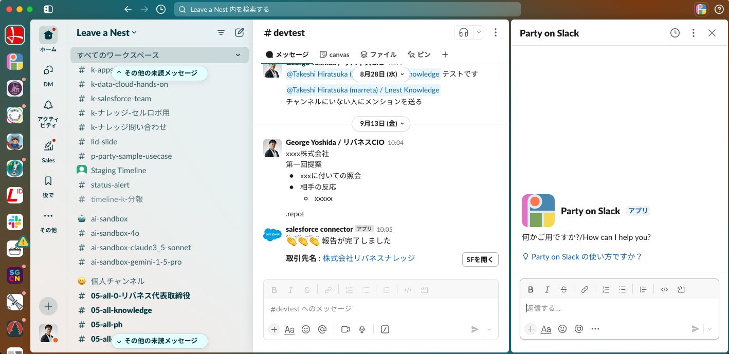 右上隅のAIエージェント呼び出しボタンをクリックすると、右カラムにParty on Slackが呼び出され、ここから生成AIを呼び出し活用することができます。