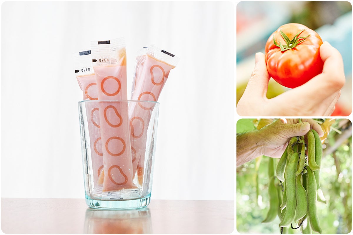 その第一弾として、ストレスフルな都会で働く人たちを食でサポートできないかという着想のもと、日高村のフルーツトマトと、地域の高齢者や障がい者とともに復活栽培をした「土佐八升豆」を使用した"トマトと豆のゼリー"の研究開発をすすめてきました。