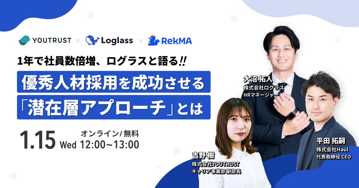 2025年1月15日(水) 12:00〜13:00 に、株式会社ログラス HRマネージャー 大沼拓人氏とYOUTRUST キャリア事業部 副部長 吉野樹氏のお二人をお招きし、「競合に先んじて優秀タレントにアプローチし、採用成果を高める方法」についてのウェビナーを開催します。