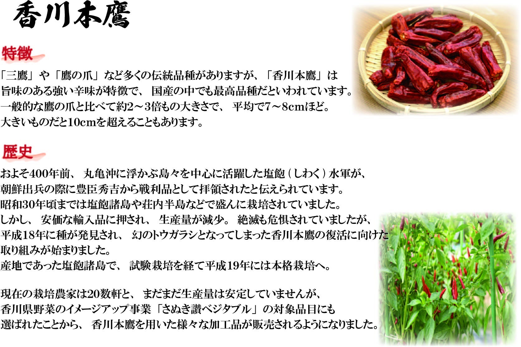地元瀬戸内海で栽培された幻の唐辛子「香川本鷹」は大粒の実と旨味のある辛さが特徴