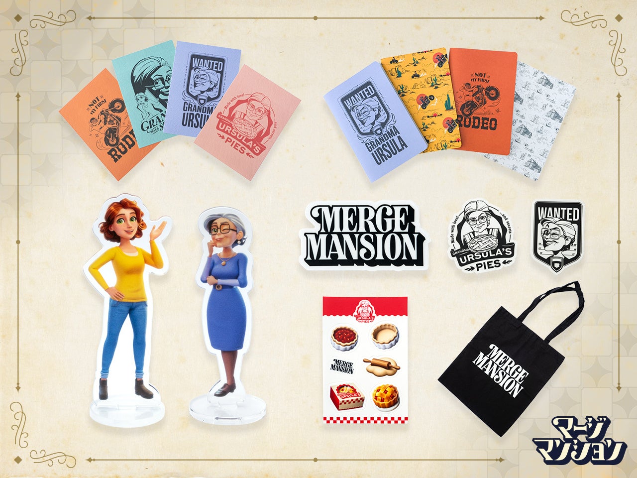特別仕様の限定BOXに入った『マージマンション』のメモ帳1冊、ポストカード2枚、ステッカー2枚、トートバッグ1個に加え、ウルスラおばあちゃんとマディーのアクリルスタンドのセットが入った豪華ギフトボックスになっております。