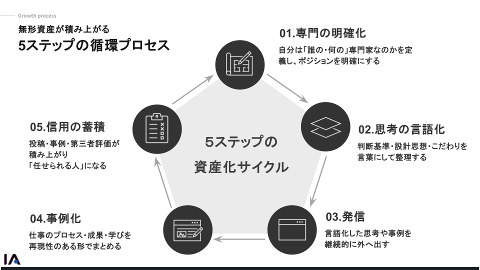 IAでは、無形資産を偶然ではなく再現性をもって積み上げるために、以下の5ステップで資産化を進めます。