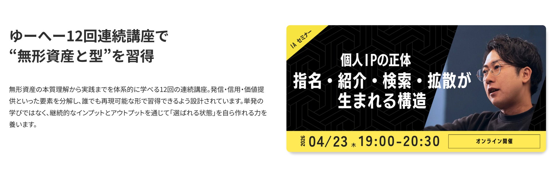 AIで知識や作業が均質化する時代に、最後に差がつくのは“人に紐づく価値”です。IAは、思想・専門性・発信・信用といった無形資産を、偶然ではなく積み上げ、仕事につなげるための場として立ち上げました。
