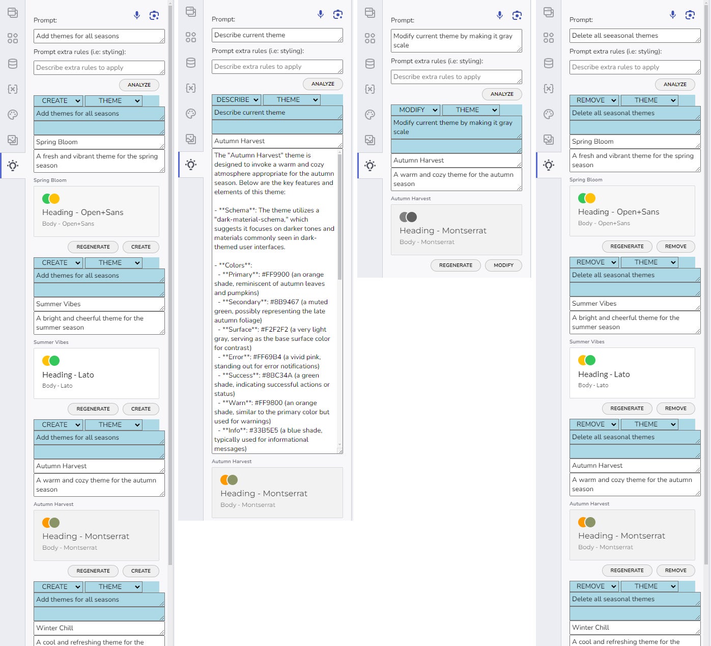 最小限の手作業で統一感のあるユーザインターフェースを保つことができるテーマ生成機能を予定しています。アプリケーション全体で統一されたビジュアルスタイルを作成するのに役立ちます。