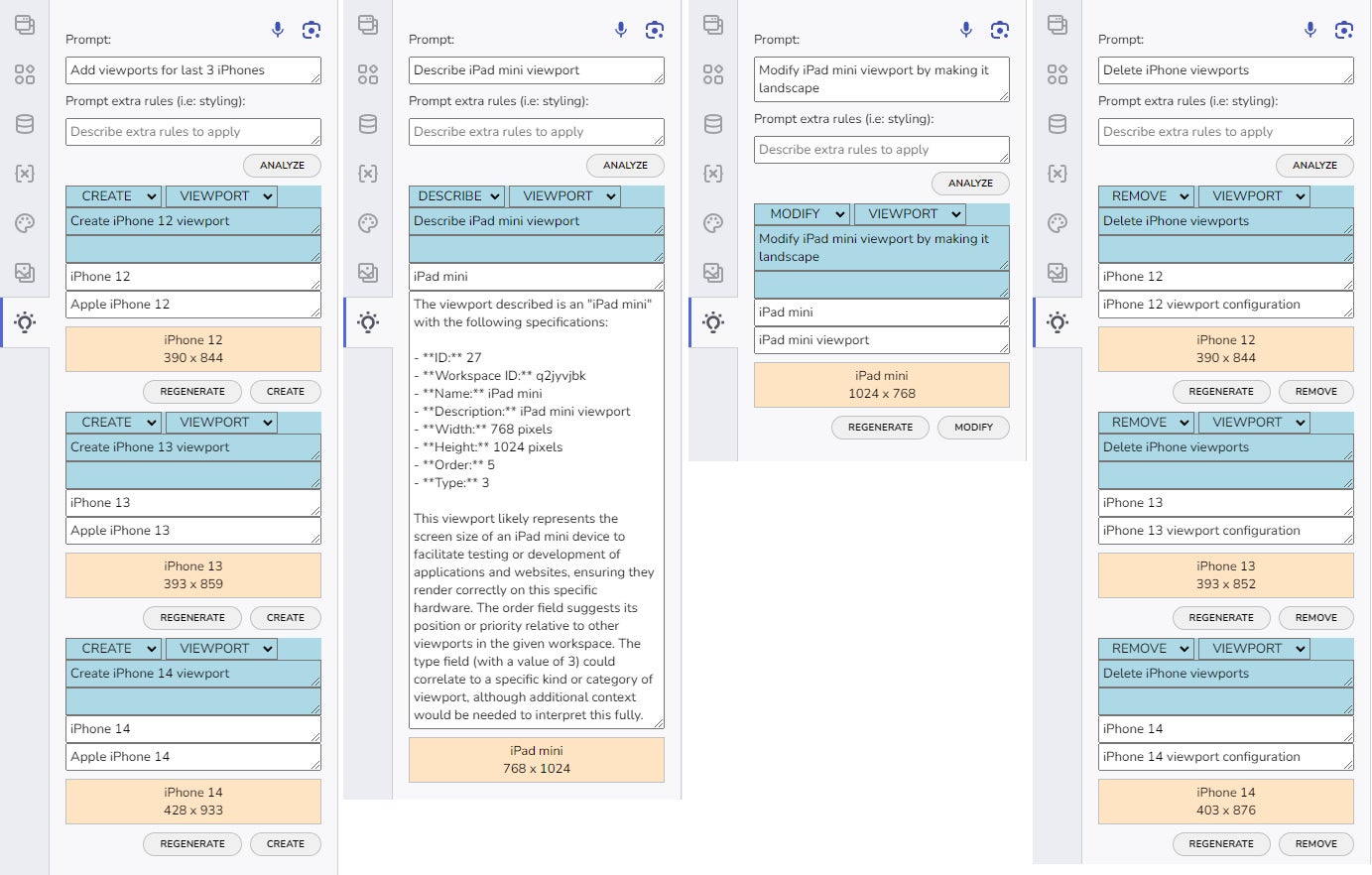 例えば「iPhone 14 の横向きビューポートを作成する」などのコマンドで、iPhone 14 の横向きビューポートを即座に生成できる機能を予定しています。シンプルで直感的なプロンプトから、多様な画面サイズや向きに合わせて視覚的に最適化可能です。