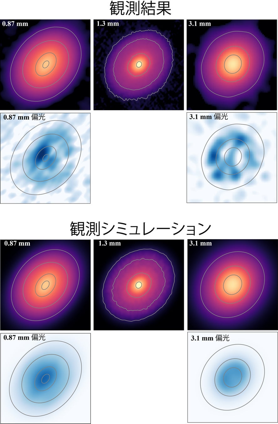 図2 (上)アルマ望遠鏡で観測したおうし座DG 星円盤の波長0.87 mm, 1.3 mm, 3.1 mmの電波強度マップおよび波長0.87 mm, 3.1 mmにおけるダストにより散乱される電波の偏光強度マップ。(下)上の観測結果と最もよく一致した場合の観測シミュレーション。