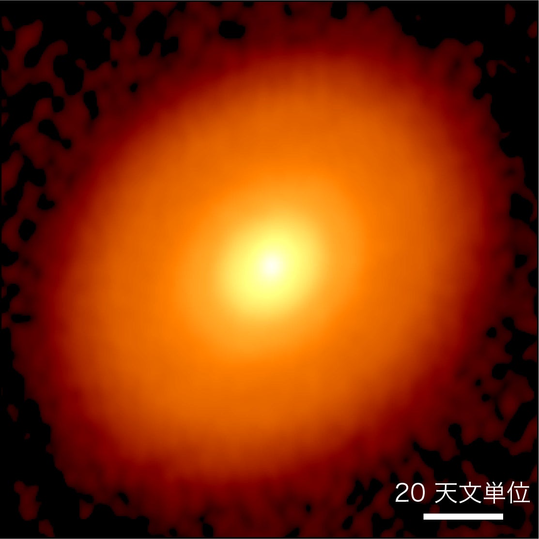 図1 アルマ望遠鏡で観測した、おうし座DG 星まわりの円盤の波長1.3 mmの電波強度マップ。より年を経た原始星周囲の円盤とは異なり、リング模様のような構造形成が進んでおらず、惑星形成の直前であることが示唆される。