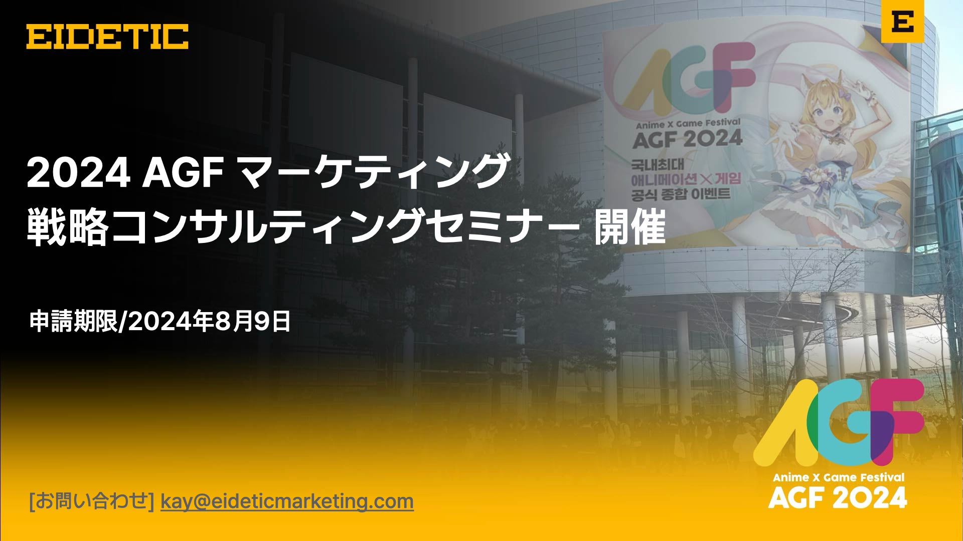 グローバル総合マーケティング会社アイデティック(代表 Ashley Jung)は、国内ゲーム会社の韓国進出を成功に導くため、「AGF2024マーケティング戦略コンサルティング」をテーマにオンラインセミナーを開催します。