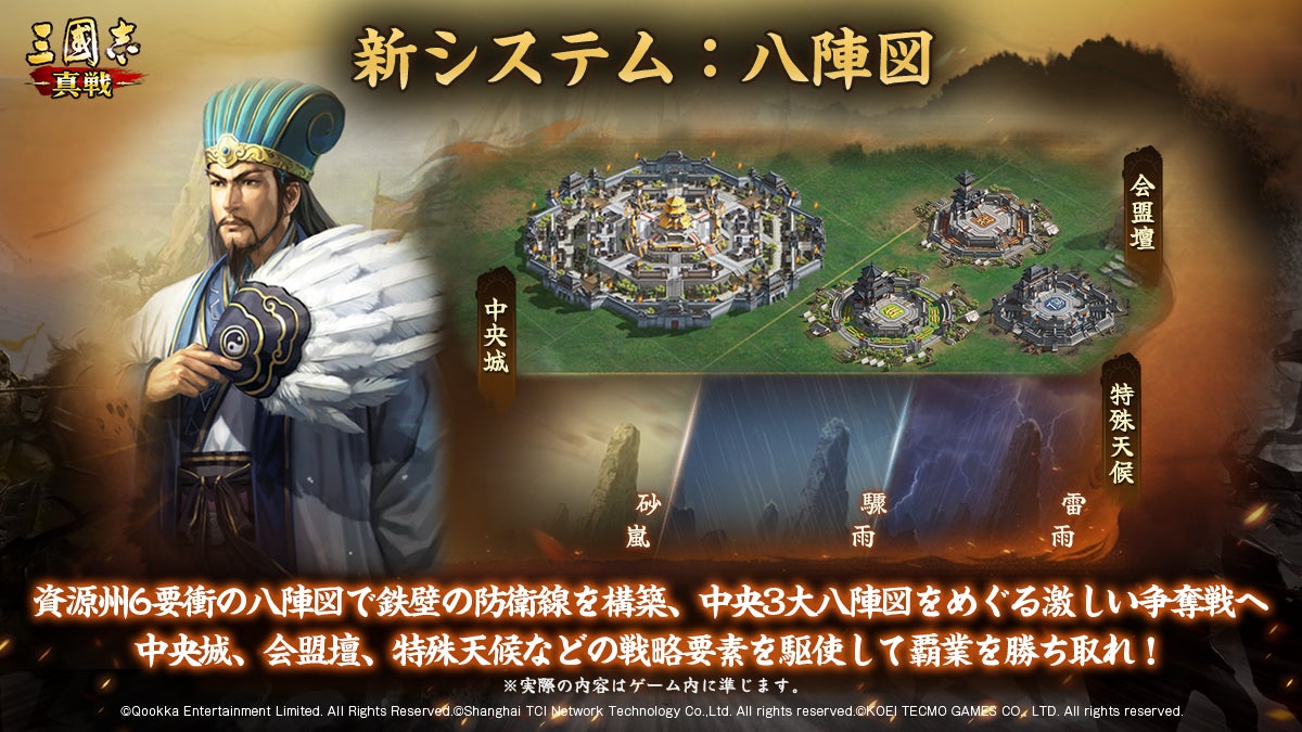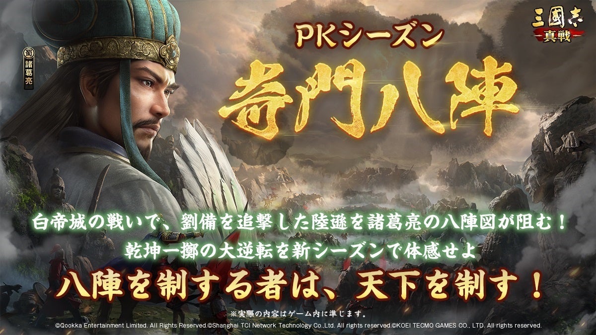 Qookka Entertainment Limitedが株式会社コーエーテクモゲームスの歴史シミュレーションゲーム『三國志13』のIPを使用し、同社監修の元で開発されたスマートフォン向けゲームアプリ『三國志 真戦』。同ゲームは、3月29日(土)より、PKシーズン「奇門八陣」を開始することをお知らせいたします。