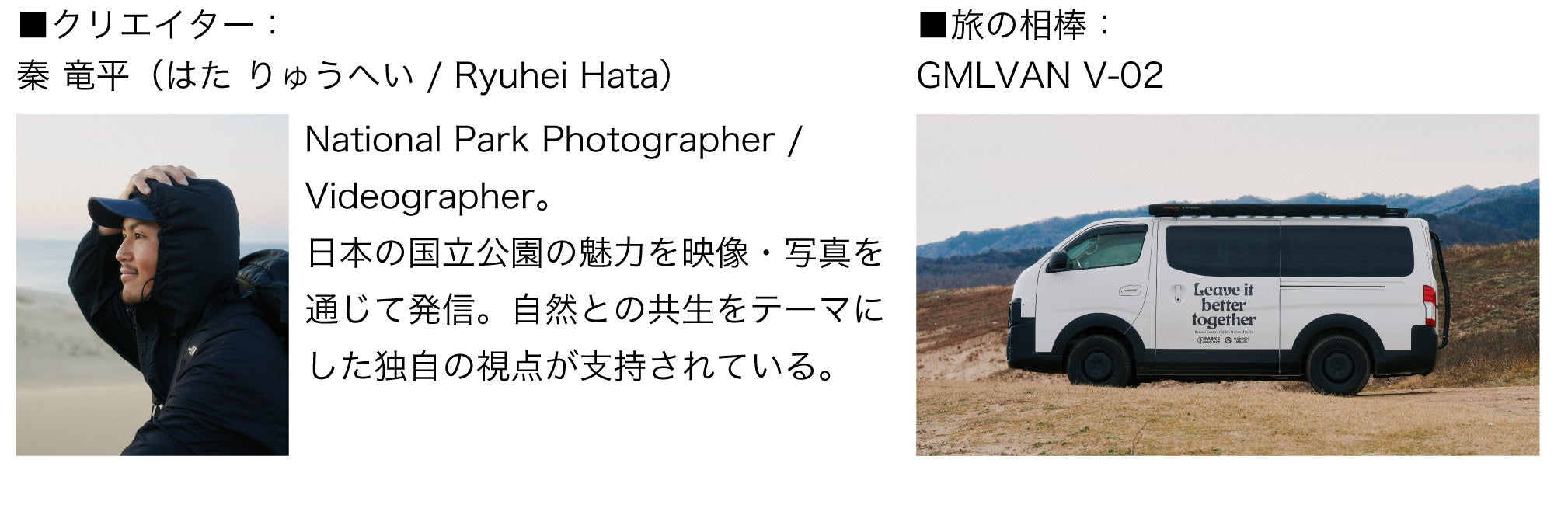 PARKS PROJECT JAPANがキュレーションするNational Park Photographer / Videographerの秦 竜平(はた りゅうへい)氏が、本プロジェクト専用のロゴカッティングシートを施した「GMLVAN V-02」と共に、日本国内全35箇所の国立公園を巡る旅に出ます。 圧倒的なスケールで描かれる国立公園の美しさを凝縮した映像は、GORDON MILLER公式Instagram中心に順次公開予定です。