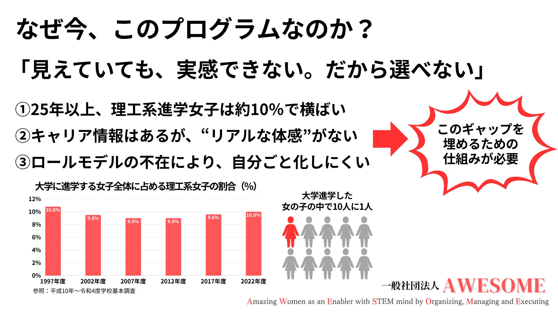 大学で理工系に進学する女子の割合は、現在も約10%。この数字は、実に25年以上にわたってほとんど変わっていません。女子の理系進路を後押しする支援は増えている一方で、「見えていても、実感できない。だから選べない」——そんな“見えにくさ”と“実感のなさ”のギャップが、いまだ大きな壁として残っています。