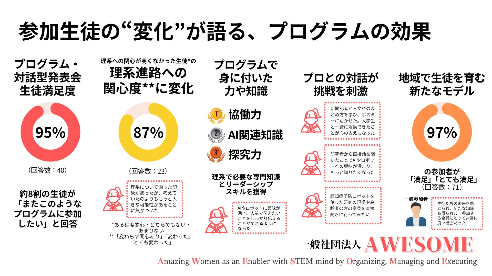 2024年度に、大阪・四天王寺中学校での中学2・3年生42名を対象に本プログラムを先行実施し、参加生徒の満足度95%、またプログラム前に理系への強い関心がなかった生徒の87%が、理系進路への関心度が上がっただけでなく、ここでの学びが刺激となり「自分たちならできる、やってみたい」という自己効力感の向上も確認することができました。また、対話型発表会の参加者満足度は97%と非常に高く、関係者のみならず、一般参加者にとっても意義のある場になったことが確認されています。