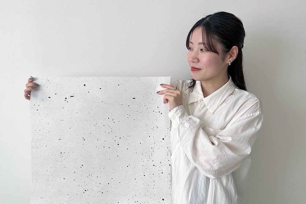 最初はデジタルでの表現を試みたものの思うようなイメージにならず、実際に和紙の上でインクを飛ばしてみることにしました。