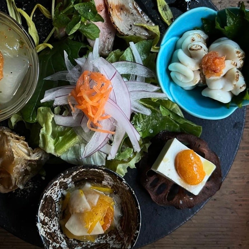 季節の食材を用いた料理を、作家による器で提供し、天然木のカウンターでお楽しみいただけます。
