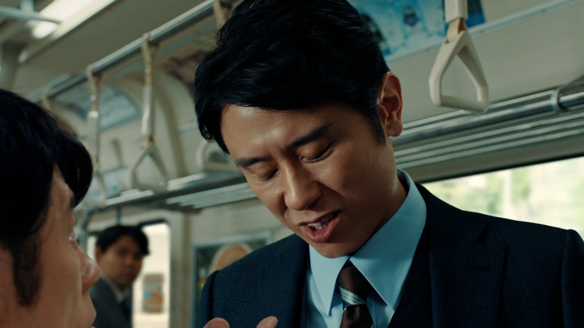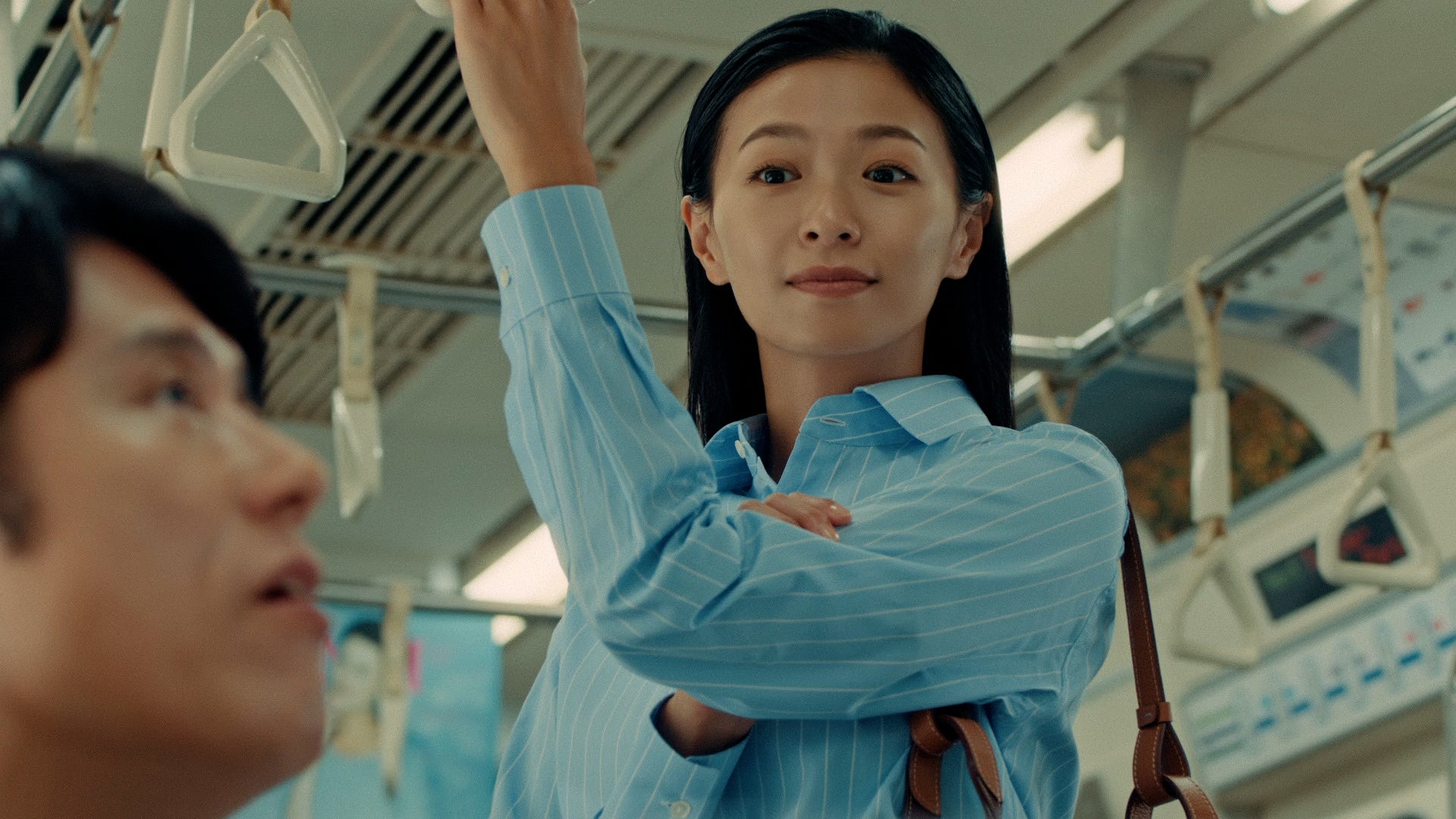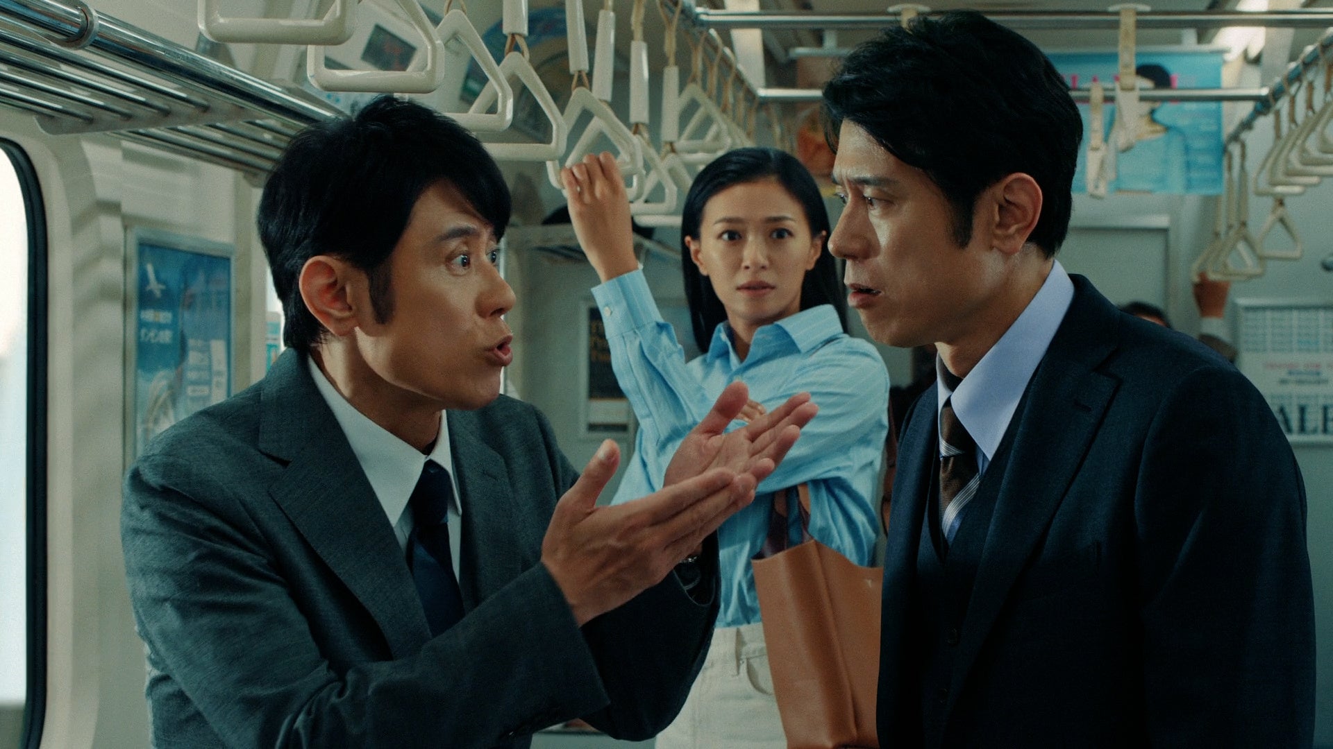 電車の中でNISAの中吊り広告を見る原田さん。「NISAか」という原田さんの声に、隣に近くでつり革につかまる榮倉さんがチラリと見ます。原田さんが「調べてからだな」とつぶやくと、いきなり目の前に1年後の未来から来た原田さんが登場。「1年後も始めてないぞ」と語る未来の原田さんですが、話を聞くと「調べてから…」と、どうやらまだNISAを始めていない様子です。そんな現在と未来の原田さんに遭遇した榮倉さんは「NISAは相談できる銀行へ!」と一言。相談窓口で榮倉さんの説明を聞く二人の原田さんは納得したように大きく頷きます。