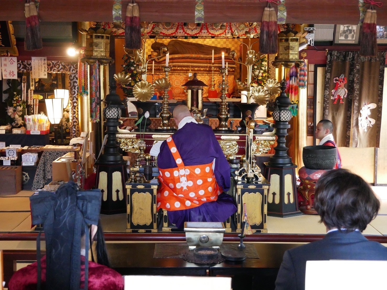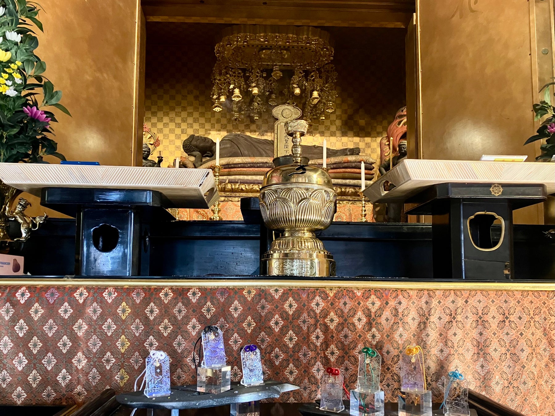 釈迦堂世尊院には、お釈迦さまの入滅を象徴する涅槃像、知恵と勇気を象徴する摩利支天像、そして財運と勝利を象徴する毘沙門天像が安置されています。これらの仏像の前で祈願される金箔は、強力なご加護を与え、願いをより一層引き寄せることができます。