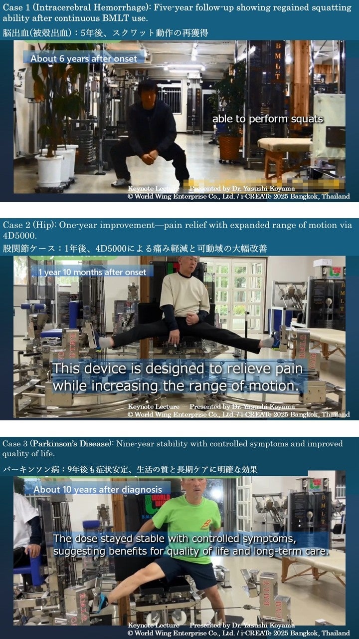 本基調講演では、B.M.L.T. カム®マシンの理論および構造概念を紹介するとともに、パーキンソン病、脳卒中後の機能障害、高齢者における運動機能の変化などについて、症例ベースの観察的知見を交えながら報告しました。