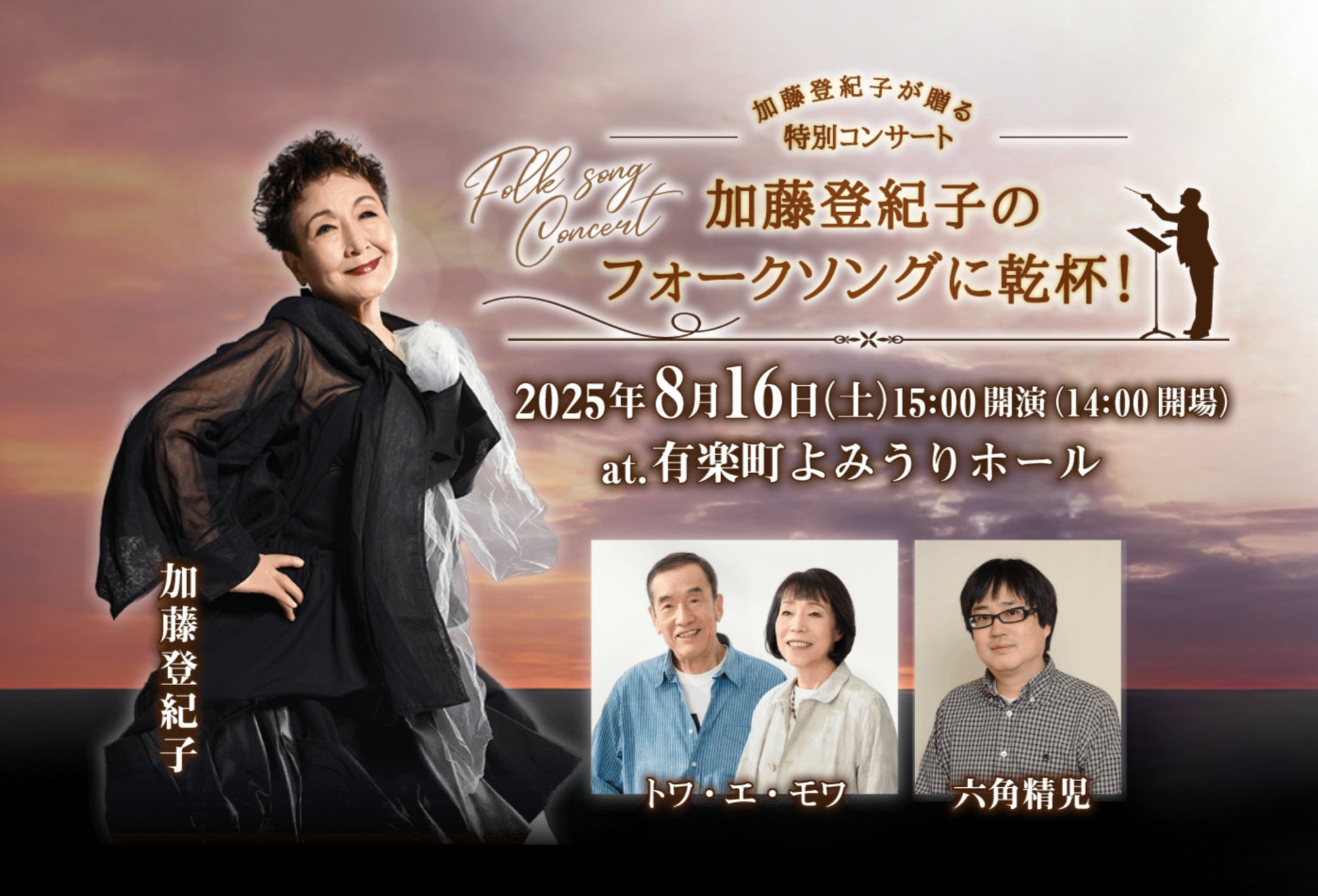 本公演では、加藤登紀子が、フォークソングをこよなく愛する俳優・六角精児、そしてフォークソングデュオ「トワ・エ・モワ」を迎え、特別な時間をお届けいたします。