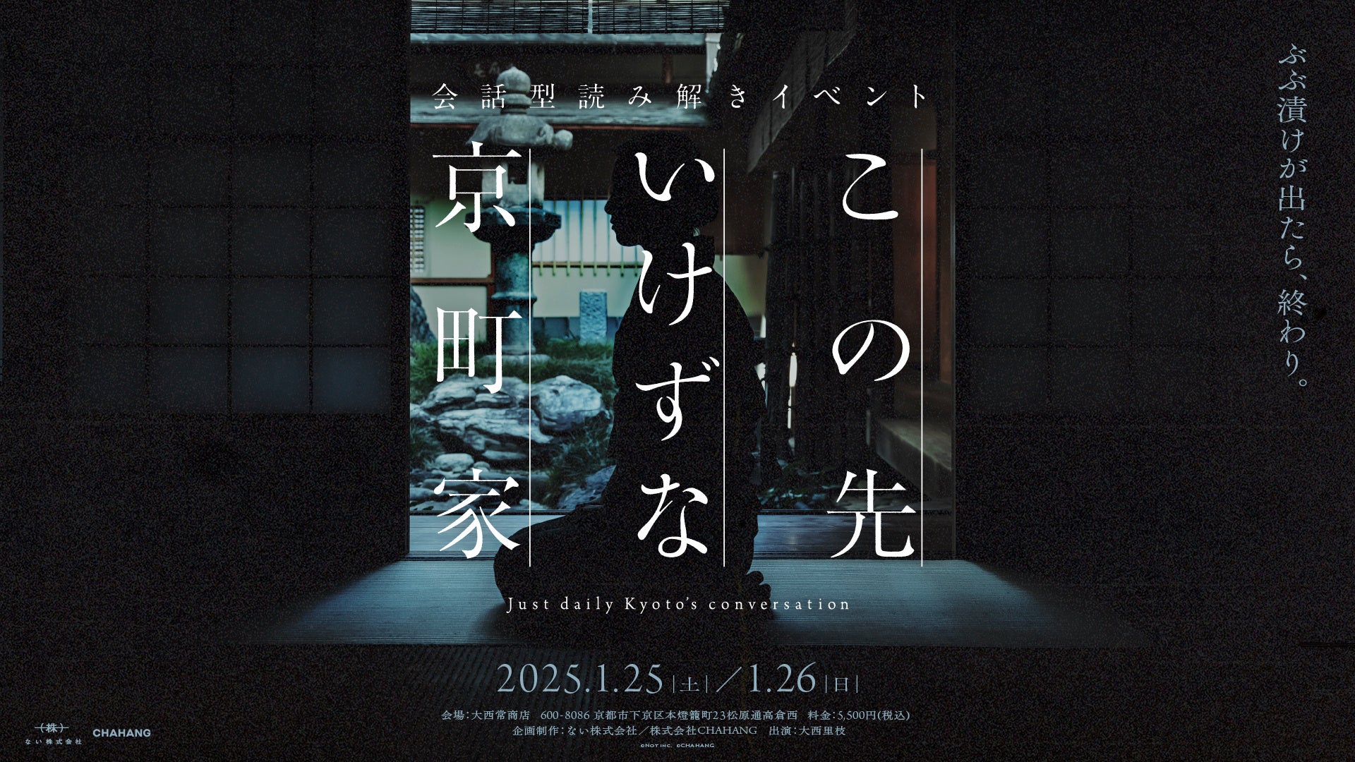 「つまらない」「みっともない」など、あらゆる「ない」からコンテンツの企画・制作を行う「ない株式会社」(所在地:大阪市淀川区、代表:岡シャニカマ)と京都のデザイン会社「株式会社CHAHANG」(所在地:京都市中京区、代表:加納寛)は、1月25日と1月26日の2日間において京都の「いけず文化」を体験できるイベント「この先いけずな京町家」を京都市の老舗扇子屋「大西常商店」にて開催いたします。当イベントは京都人の日常会話で繰り広げられる「いけず」を洛外の方でも楽しみながら体験できるよう、実際に京都人と会話する中で建前から本音を読み解く部分にゲーム性をもたせたステージクリア型のイベントです。