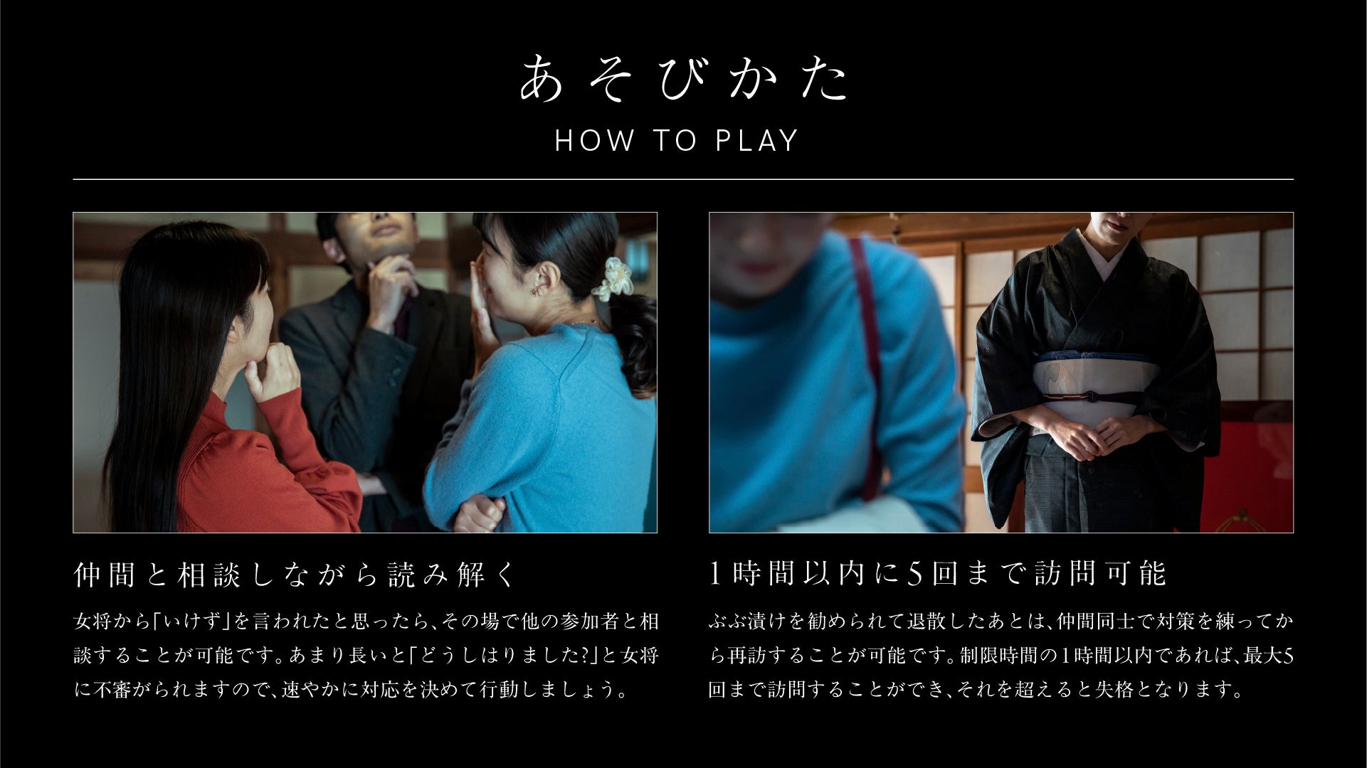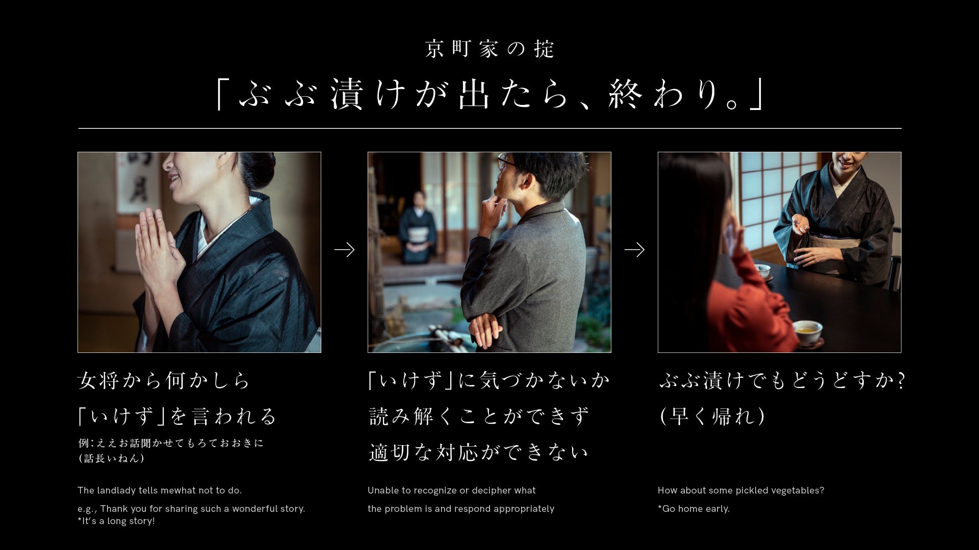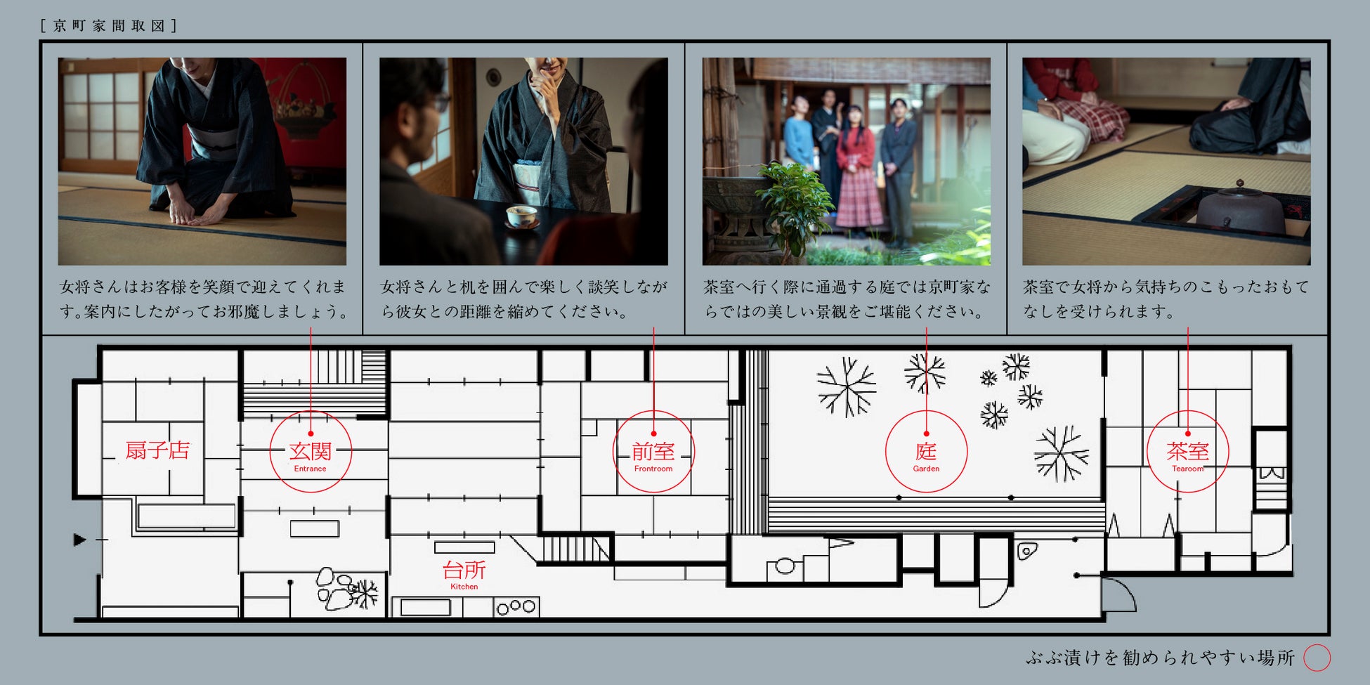 参加者は大西常商店・4代目の大西里枝氏が演じる「いけず女将」の住む京町家を訪問。女将の何気ない一言の裏には別の本音が潜んでいる場合があり、読み取って適切な行動ができないと「ぶぶ漬けでもどうどすか?」と言われます。これは古来から京都で「早く帰れ」を意味する言葉で、言われた場合は一度退散しなければなりません。5回訪問するうちに全ての「いけず」を読み解き、女将の信頼を得られればクリアとなります。