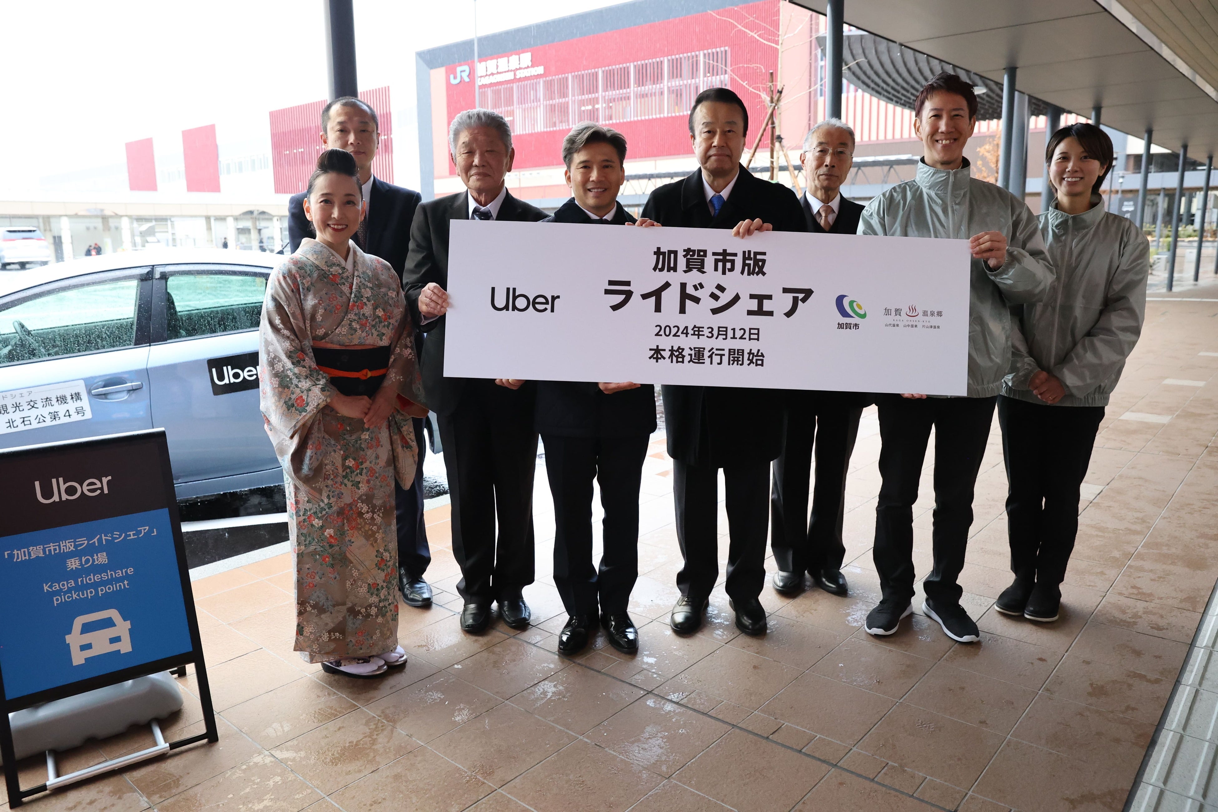 そこでUber Japan は、世界70カ国以上で活用されているUberアプリを活用し、3月12日より加賀市観光交流機構、加賀第一交通とともに「加賀市版ライドシェア」の提供を開始します。本ライドシェアは、午前7時から午後7時までは主要観光地や住宅地で、午後7時から午後11時までは加賀市全域で利用可能で、加賀第一交通による面接・研修と国の指定講習を受けた住民ドライバーが稼働します。加賀第一交通が住民ドライバーや車両の安全管理を行い、Uberがアプリを通じて乗客と運転手のマッチング、配車依頼、決済サービスを提供します。また3月16日に新たに開業する「北陸新幹線 加賀温泉駅」のロータリーには、本ライドシェア専用の「Uber専用乗り場」が設置され、新幹線を降りたお客様がUberアプリを通じて配車した車にスムーズに乗車できるようになります。住民ドライバーには70名以上の応募があり、選考と研修を実施した方から稼働を始めています。