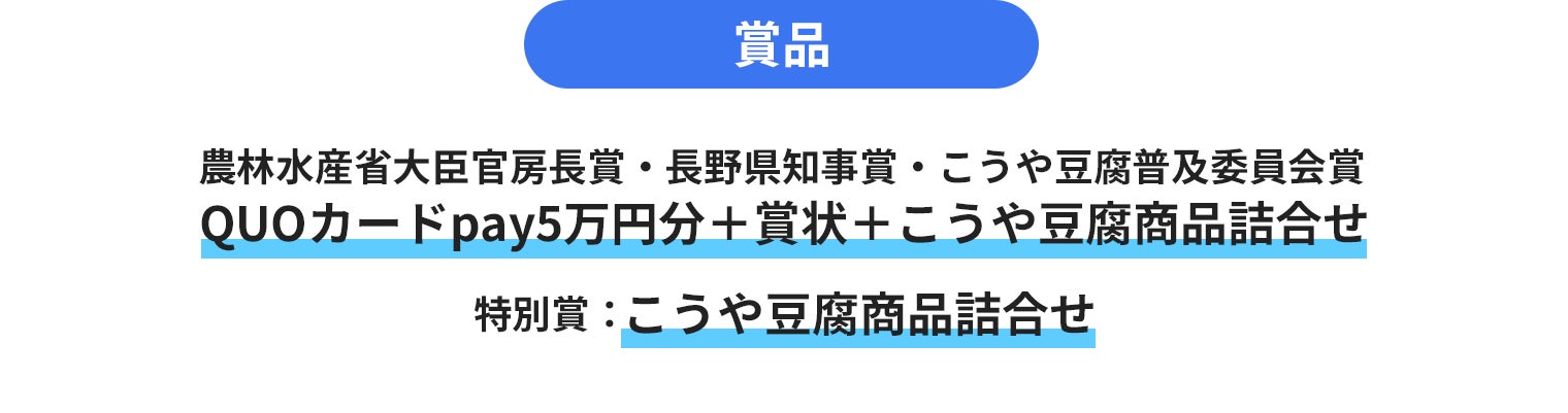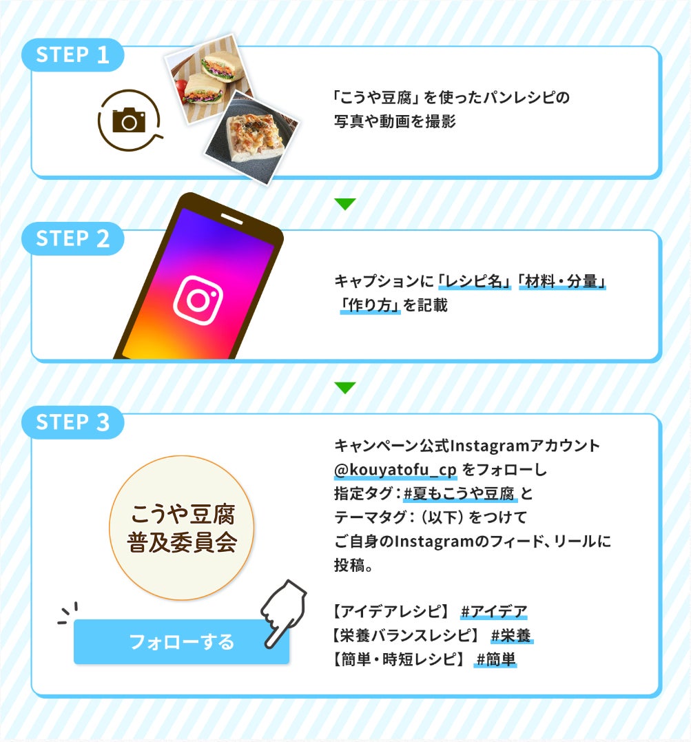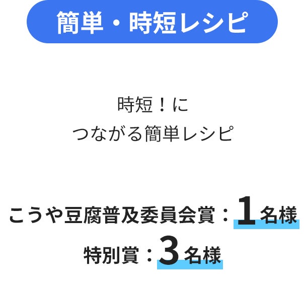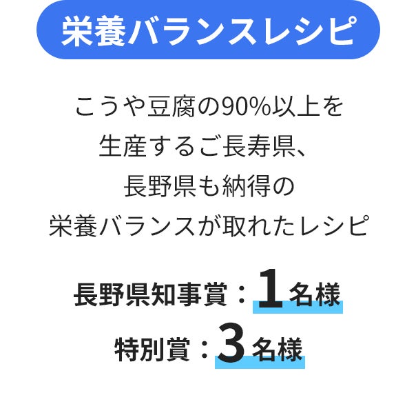 コンテストでは、3つのテーマに沿った賞を準備。目から鱗の「アイデア」レシピ、からだ想いの「栄養バランス」レシピ、「簡単・時短」レシピ、いずれかをオリジナルで考案し「#夏もこうや豆腐」とテーマタグをつけて応募!