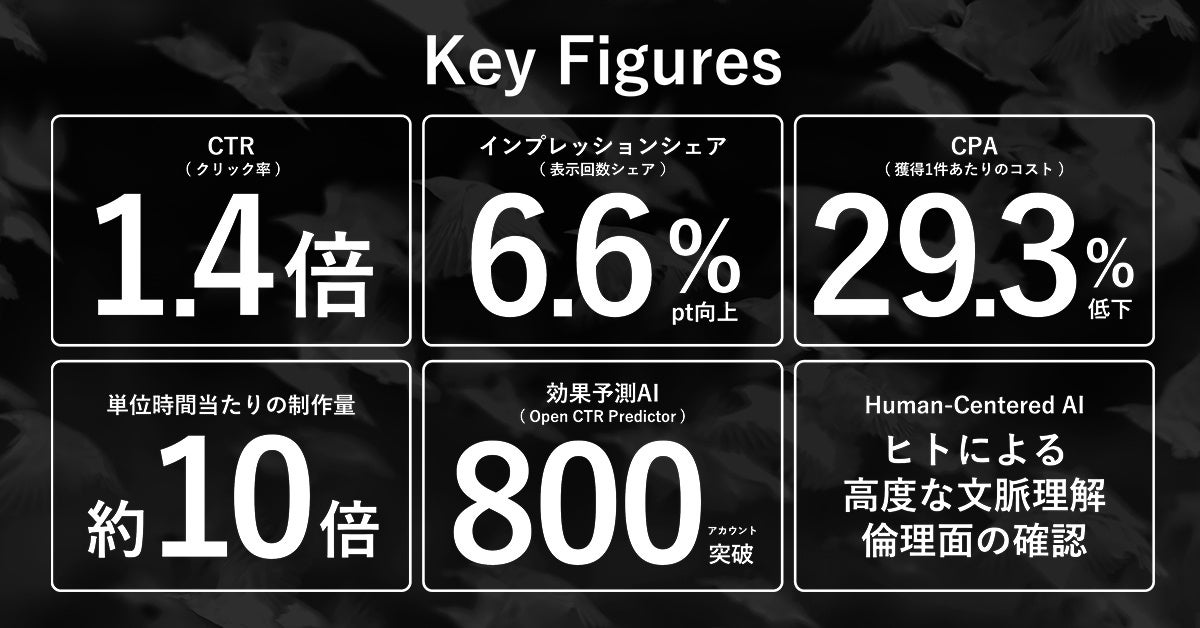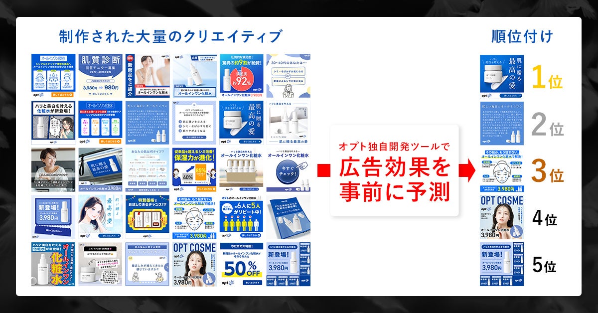 昨今、急速に普及している生成AIは、クリエイティブ制作において、単位時間あたりの制作量を飛躍的に高めました。制作された多くのバリエーションは、事前に効果予測にて選抜を行うことで、広告効果の向上に貢献します。当文脈においては、2023年10月より、オプトと共同で、効果予測AI Open CTR Predictorを開発・提供(※2)しており、既に800人以上の方々にご愛用いただいております。