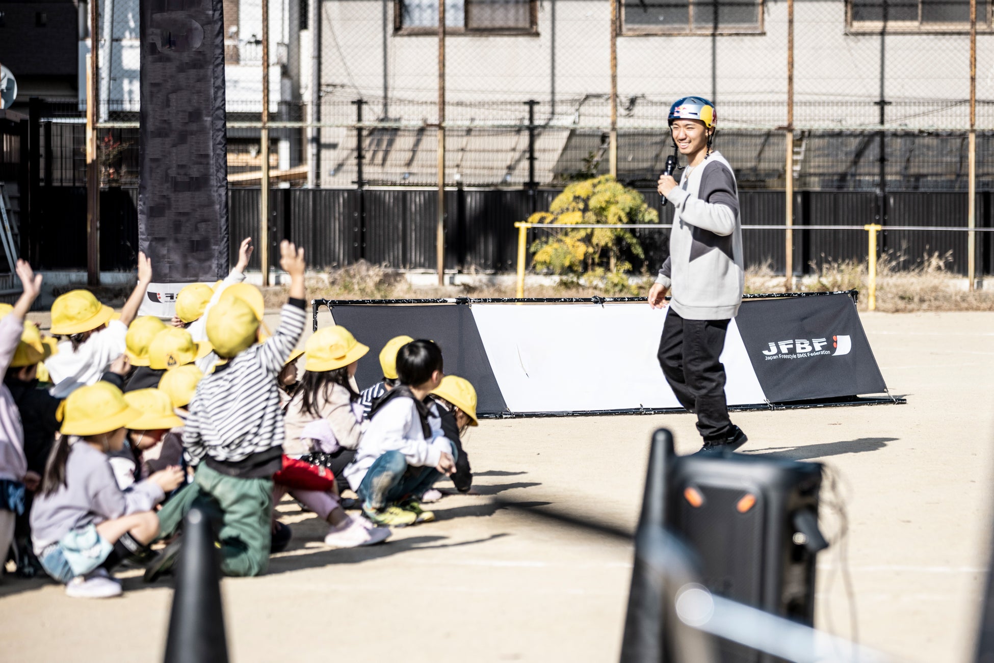 本企画はJFBFとマイナビが共同で企画したもので、BMXフリースタイルの日本トップクラスで活躍するライダーが小学校を訪れ、競技の魅力を紹介しながら「じぶんスタイルな生き方」について一緒に考えることで、小学生がキャリアに対して探究心を持つきっかけ作りを行う取り組みです。ジャンプ台を持ち込んだ圧巻の空中パフォーマンスも披露し、「BMXフリースタイル」という未知の世界からの刺激も直接肌で感じていただきます!