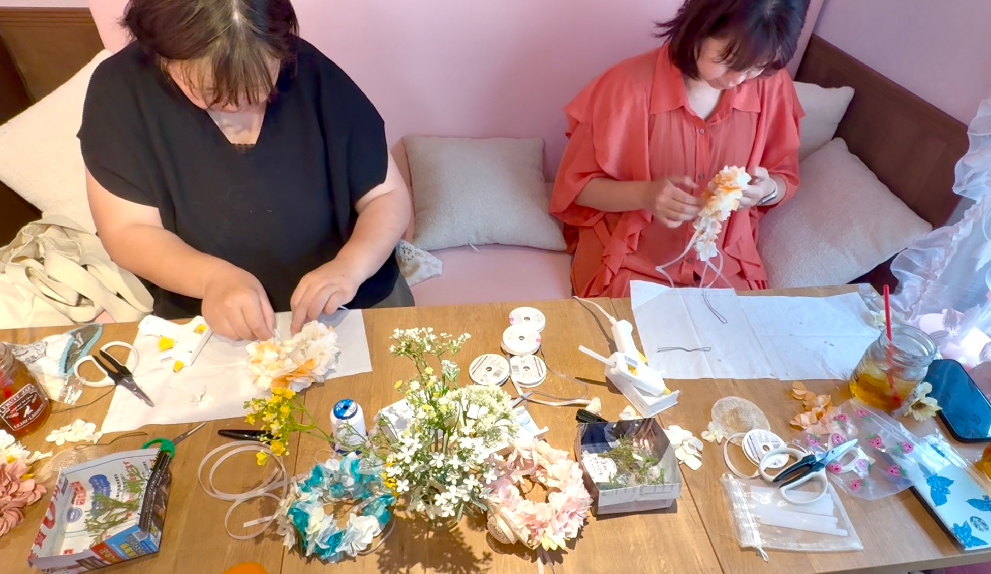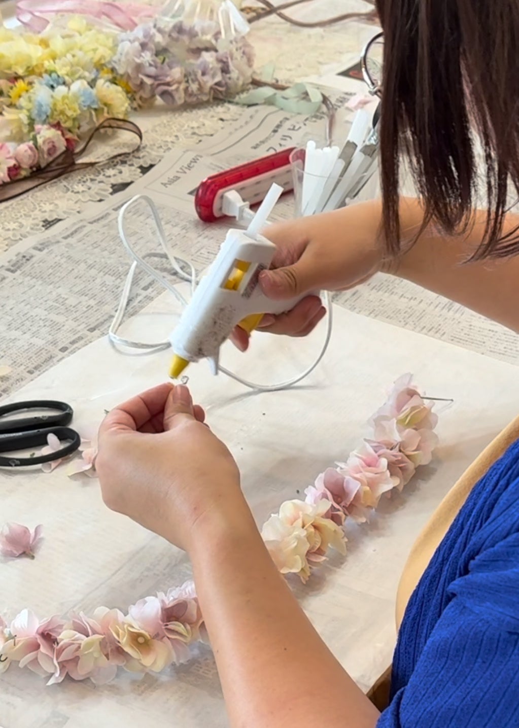 やわらか花かんむりは誰でも簡単につくれます。グルーガンで張り付けるだけ。インストラクターになると、教えたり、販売することが可能になります。