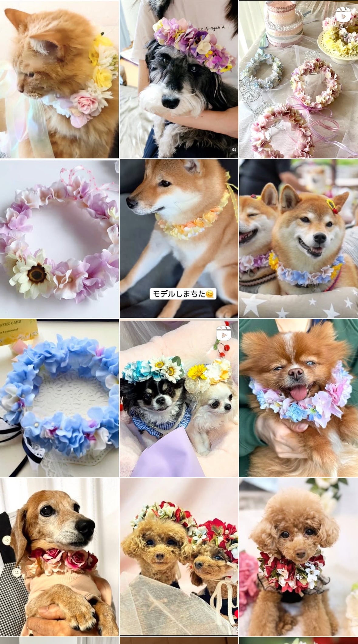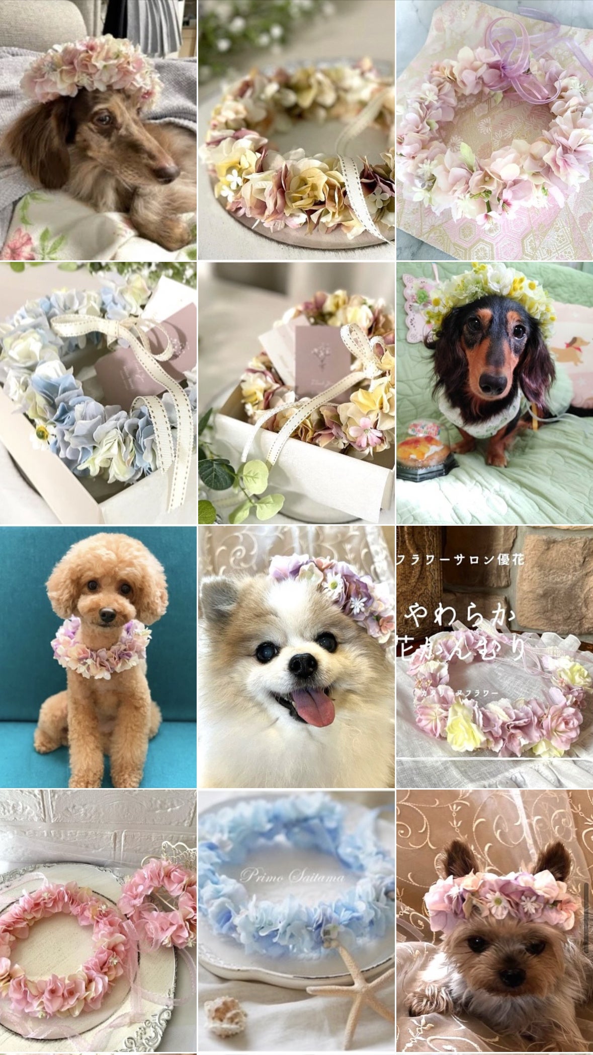 日本一安全な花かんむりが登場!一切ワイヤーつかいません。一般の方が作った花かんむりをつけた ワンちゃん ねこちゃんの写真が並びます。やわらか花かんむりとして、特許意匠登録済