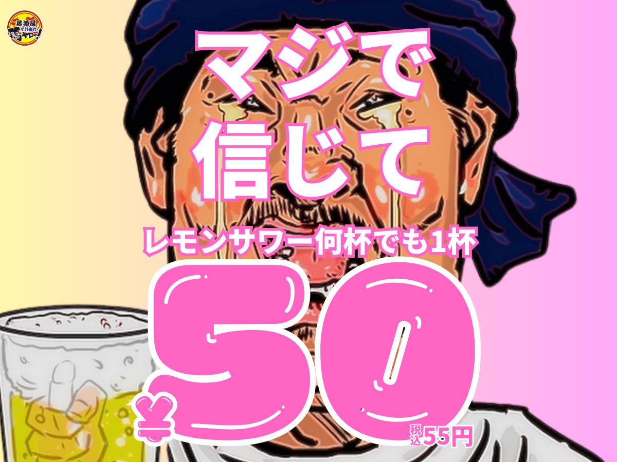 なんといってもレモンサワー50円! お通しのえびせんは⾷べ放題!!