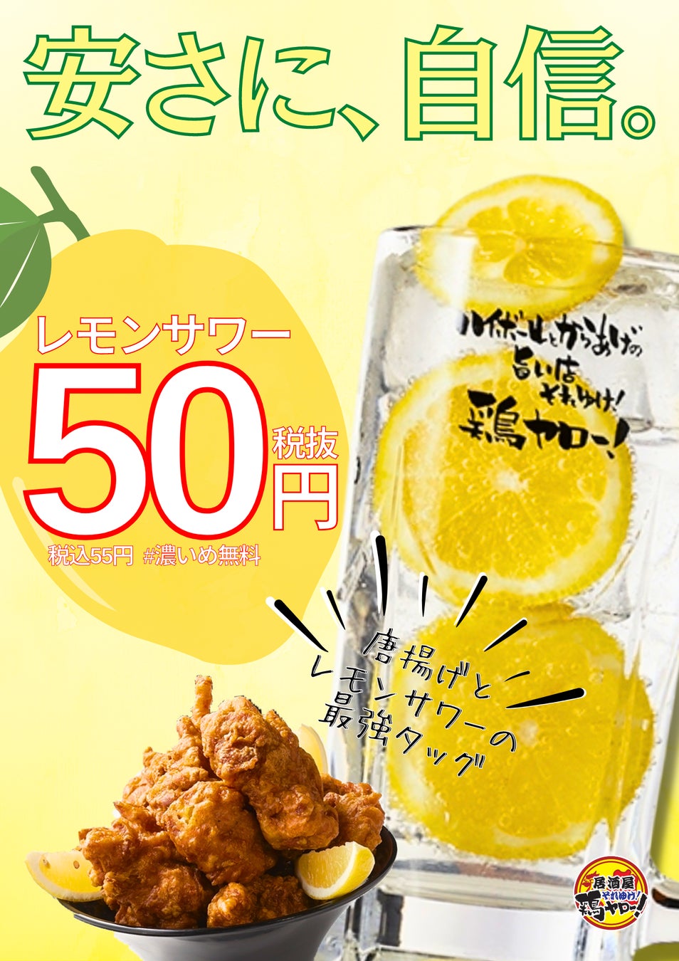 鶏ヤローの最⼤の⽬⽟は「50円のレモンサワー」。