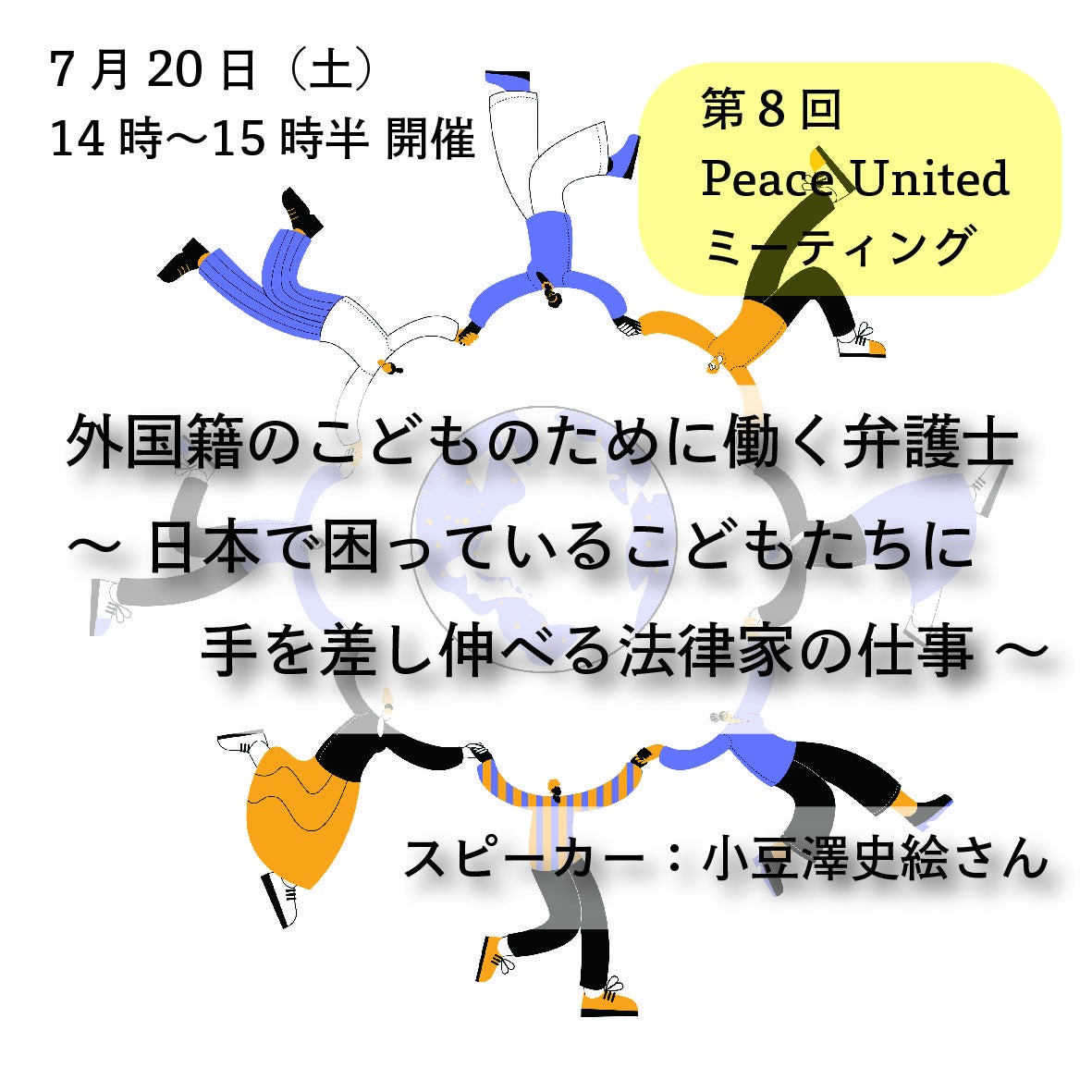 第8回目となるPeace Unitedミーティングには、外国籍のこどもたちのために働いている弁護士、小豆澤史絵さんをスピーカーとしてお招きします。