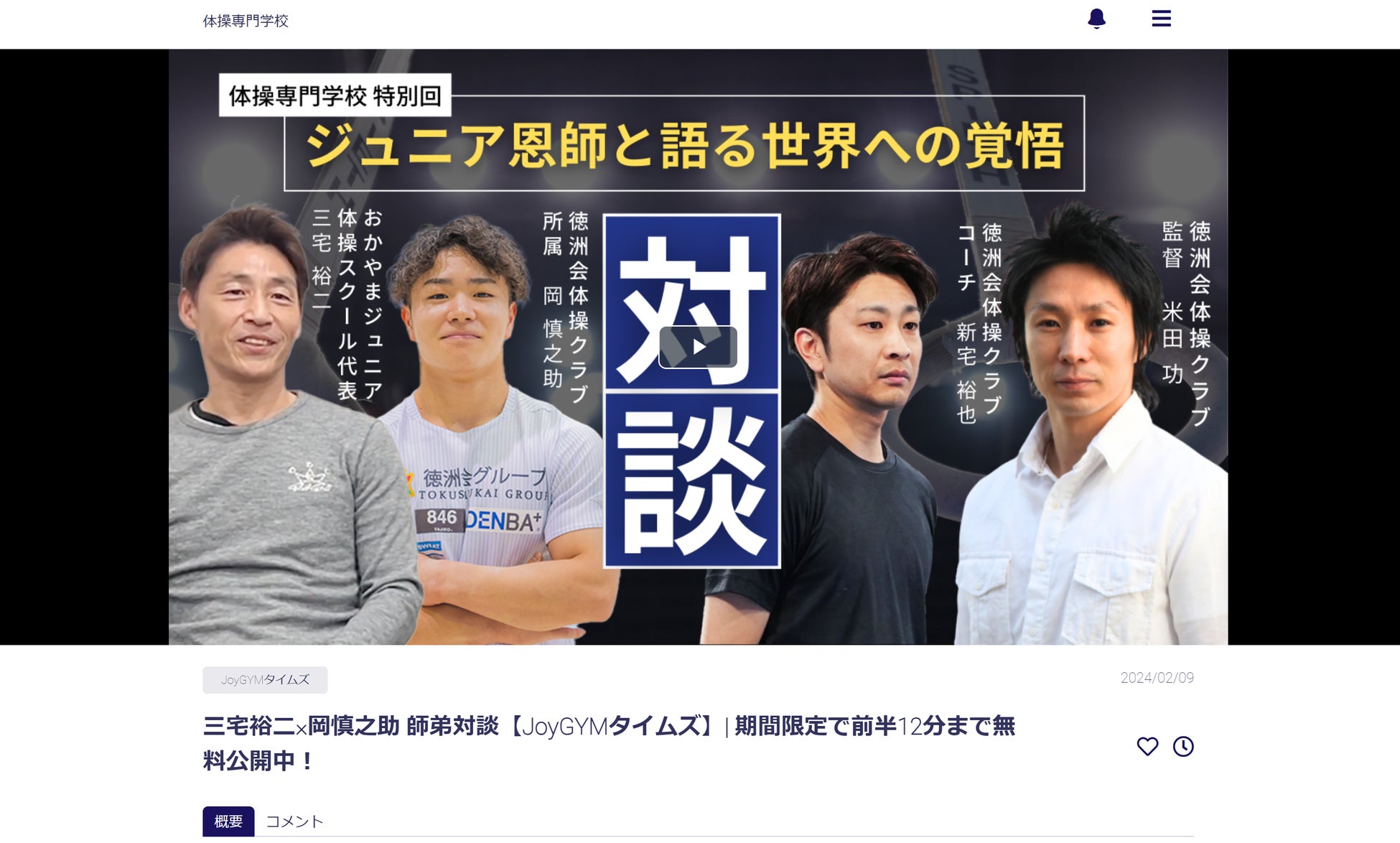「体操専門学校」では米田 功 氏のメンタル・考え方に関するコンテンツや、金メダリストである岡慎之助選手、杉野正尭選手との対談動画などもご視聴いただけます。