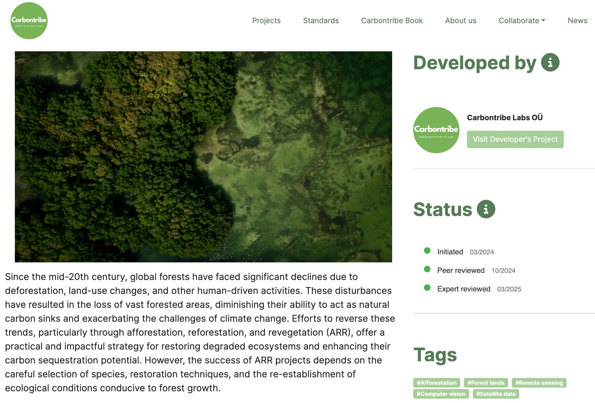 同社の独自開発したカーボントライブスタンダード(方法論)は世界的なスタンダードが採用するIPCC準拠の科学的手法にAIプロセスとWeb3技術を組み込んだユニークなもので、完全リモートな森林解析を可能とし、第三者認証機関Earthood社の認証を受けている。