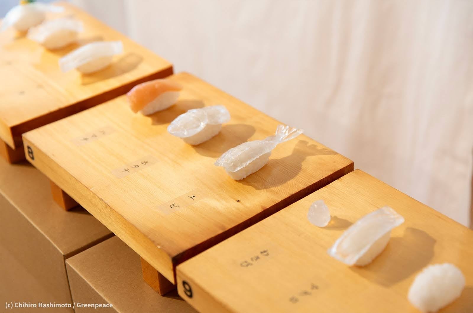 和食の花形、お寿司にも気候変動の影響が迫っています。海水温の上昇や海洋酸性化などにより食べられなくなるネタが増えると予想され、より詳しい調査が求められています。本作品では、無くなる可能性に応じて透明度を変化させた樹脂オブジェの寿司を作成しました。私たちの日常生活に現れるであろう、気候変動の影響を直感的に感じていただける内容です。