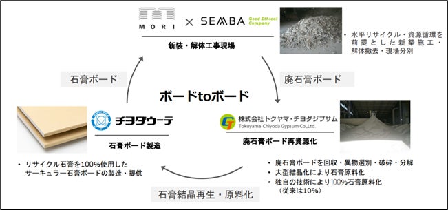 これらの課題を解決するため、施工事業社(森ビル)、内装業者(船場)、建築資材メーカー (チヨダウーテ)、廃石膏ボードリサイクル会社(トクヤマ・チヨダジプサム)の連携により、 水平リサイクルを実現します。