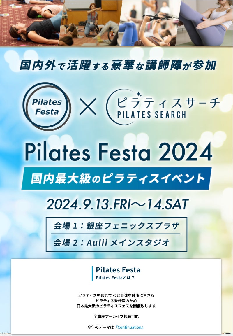 株式会社Aulii主催の国内最大級のピラティスイベントが2024年9月13日(金),14日(土)に東京/銀座にて開催されます。ピラティスサーチもメインスポンサーとしてコラボレーションいたします!