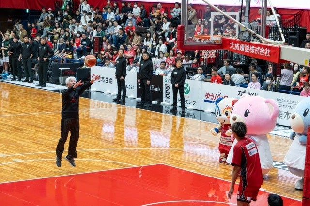 そして、10月20日の始球式は、熊本ヴォルターズのコラボ店舗である「Let’sヴォルリハ!」の利用者様に務めていただきました。施設内のバスケットゴールに毎日ボールを投げてから帰宅される方で、今回「Let’sヴォルリハ!」の利用者様の中に希望者がいないかお声掛けした際も、「ぜひチャレンジしたい!」とすぐに声を上げてくださいました。始球式当日、惜しくも投球はリングに当たり外れてしまいましたが、終始笑顔で挑戦してくださいました。始球式後のご感想では、「今回、ヴォルターズの試合観戦という機会を得て会場の一体感の中、ドキドキ、ワクワクといった気持ちの高揚が感じられ、感動し心の健康につながったと思う。また、家族との観戦では共に喜びを分かち合うことが出来、明日への活力が得られた。」と、アクティブエイジングを体現するような取り組みとなったことを、楽しそうにお話しくださいました。